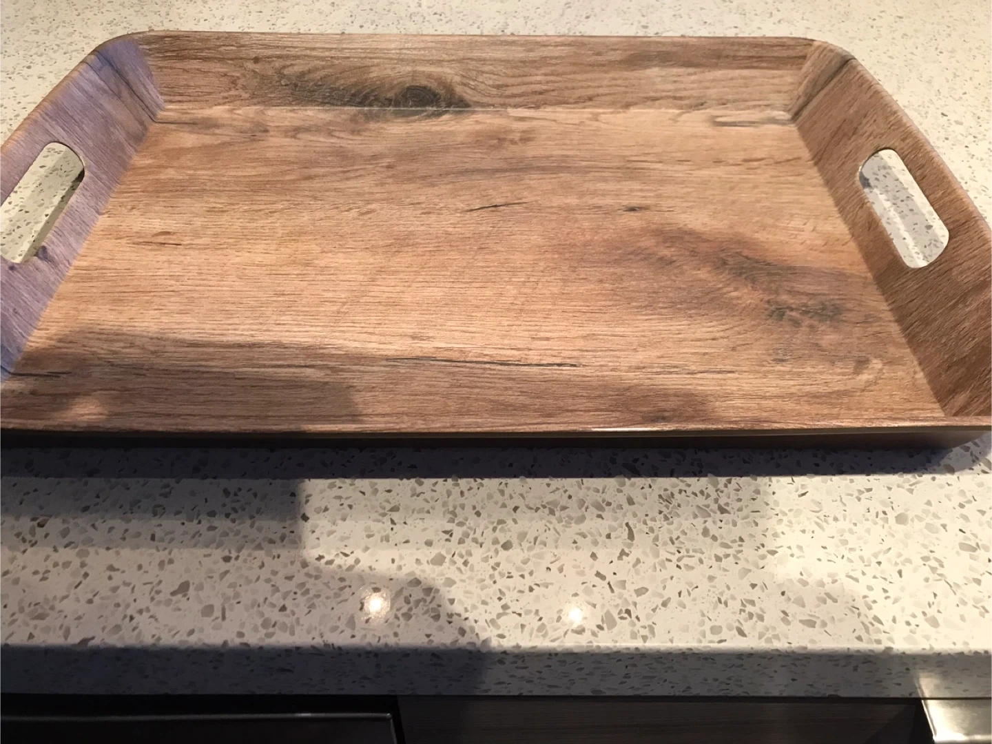Wooden-look serving tray with two cut-out handles. It's a great size for serving drinks or snacks. Durable and easy to clean!