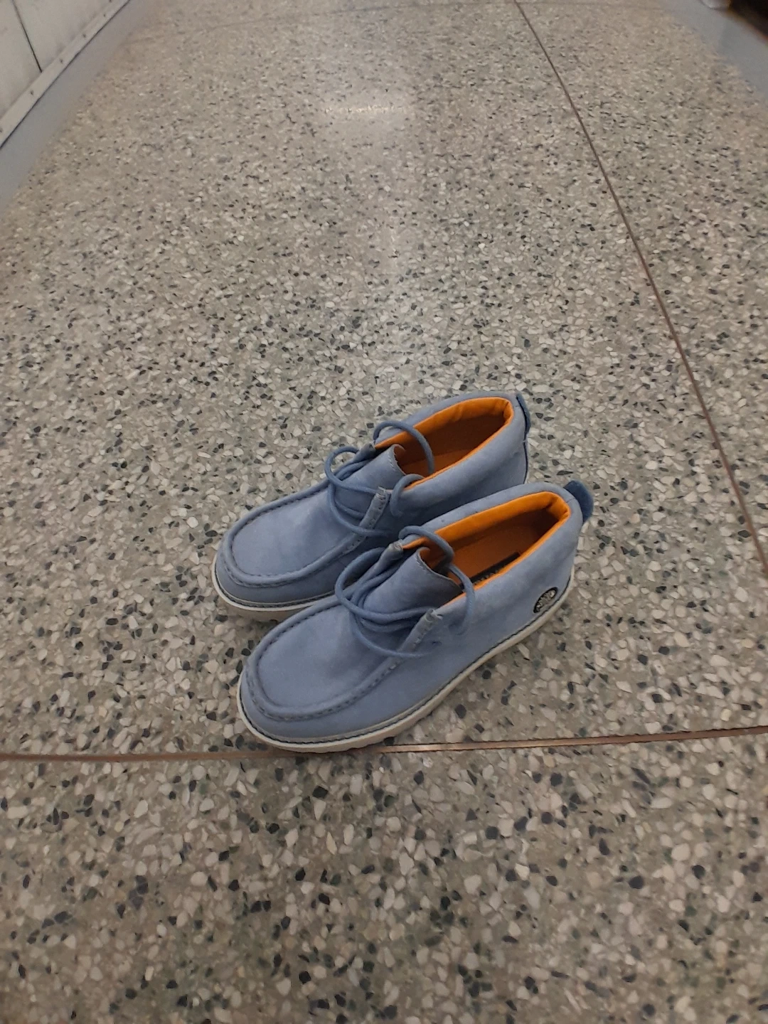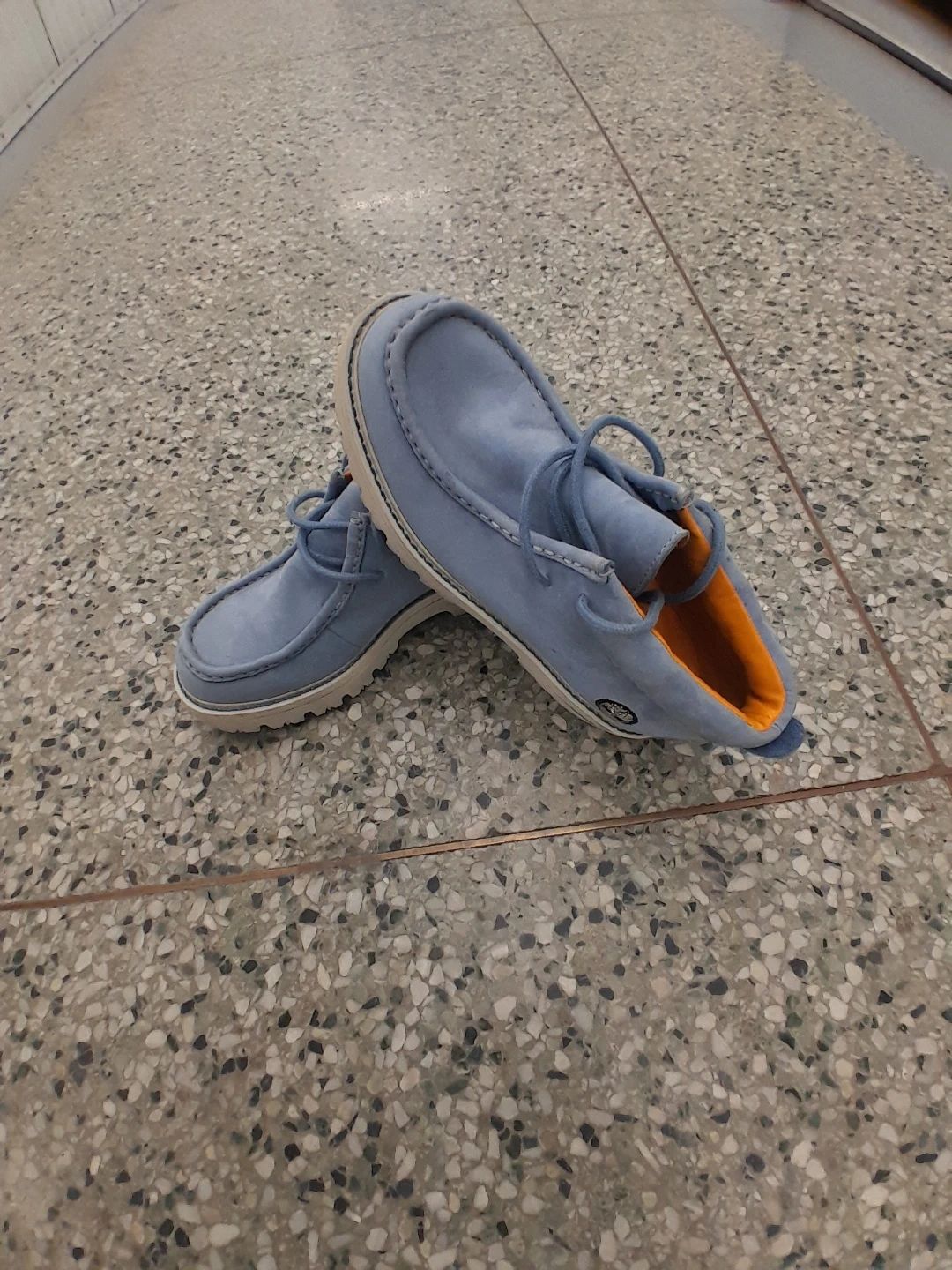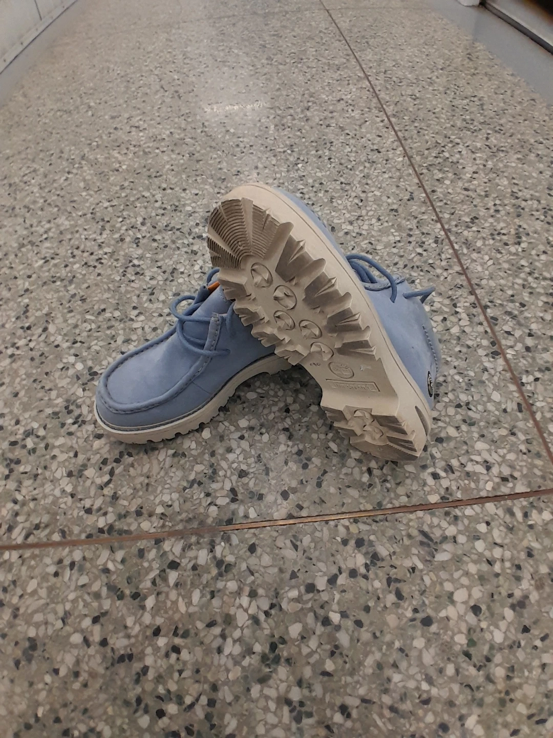 Timberland chukka boots in a light blue suede. Features a rugged sole for good traction. The interior is lined with a bright orange material Men's Size 7