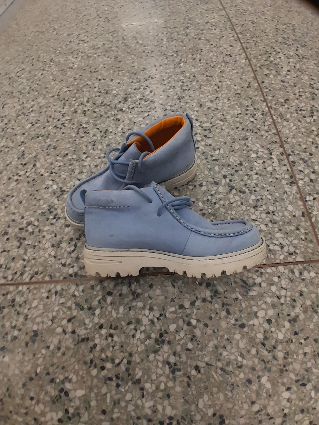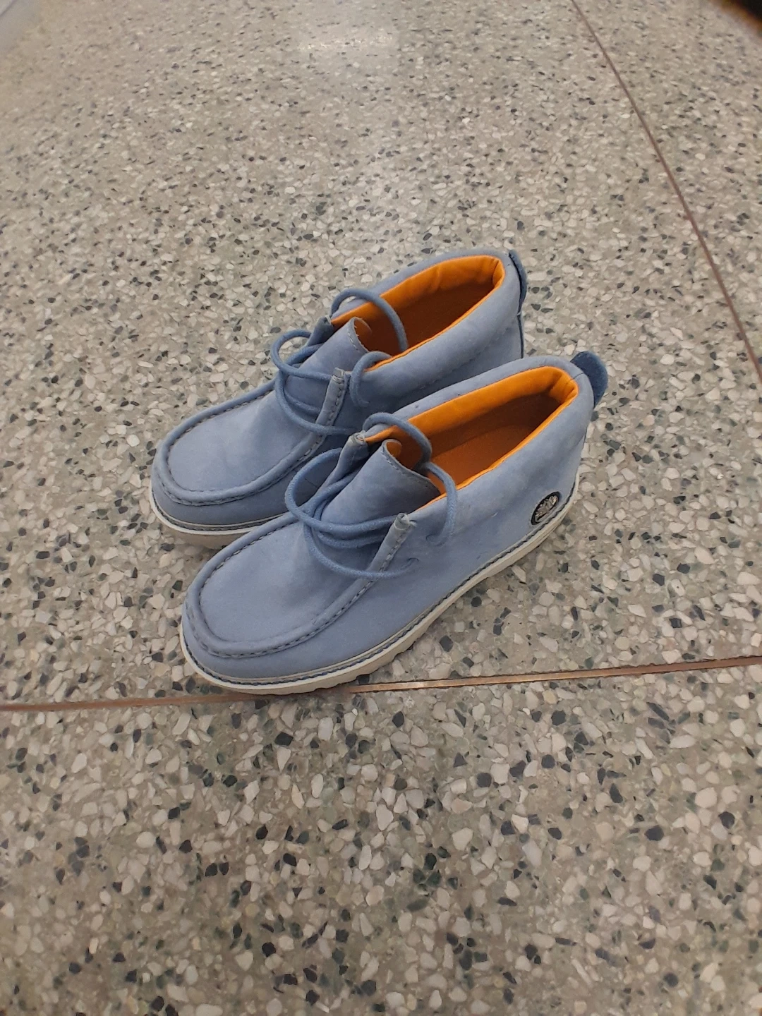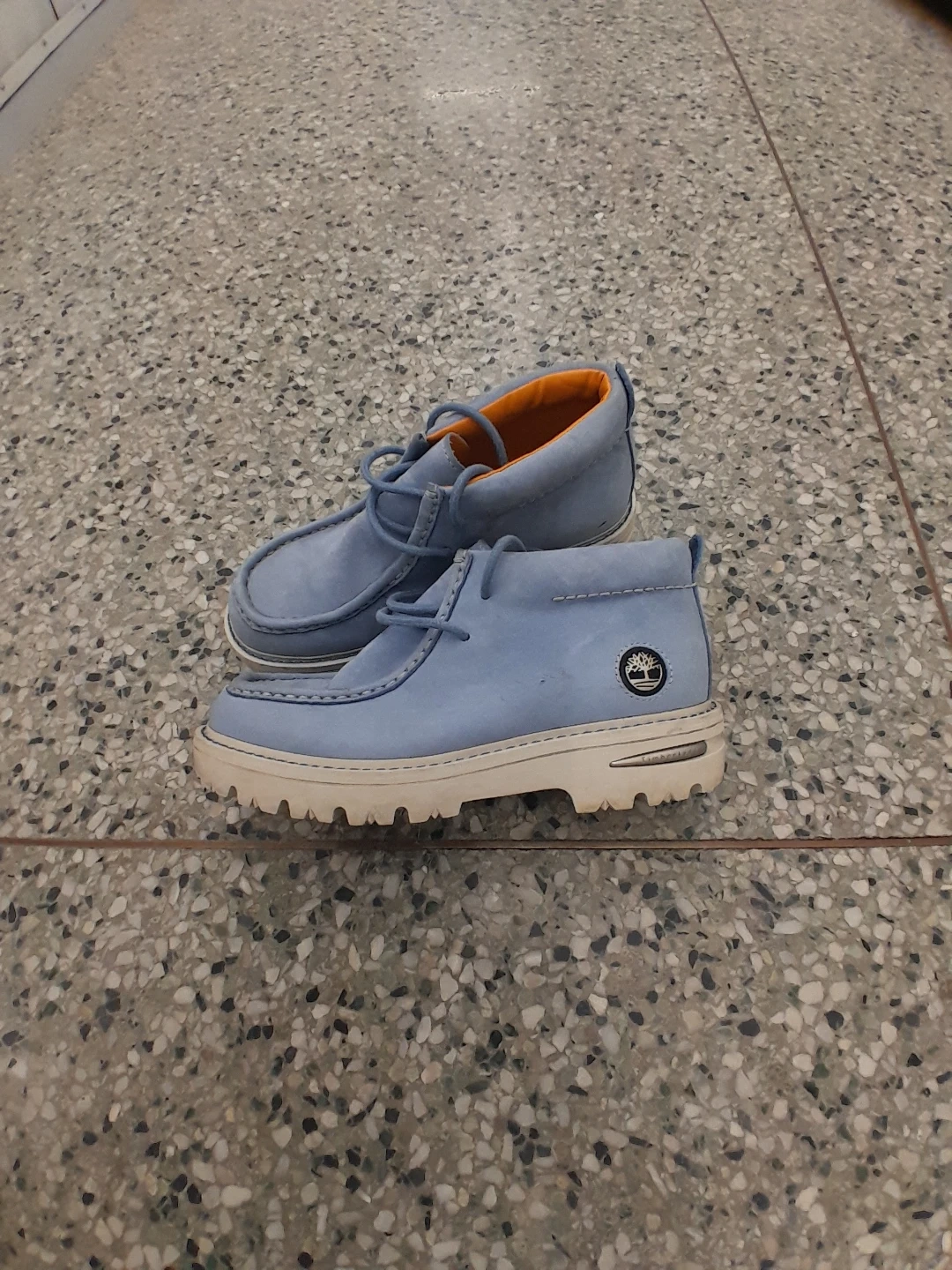 Timberland chukka boots in a light blue suede. Features a rugged sole for good traction. The interior is lined with a bright orange material Men's Size 7