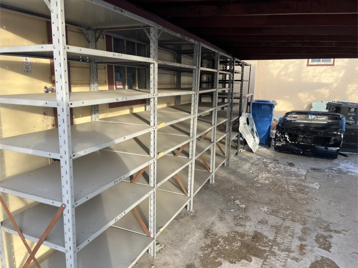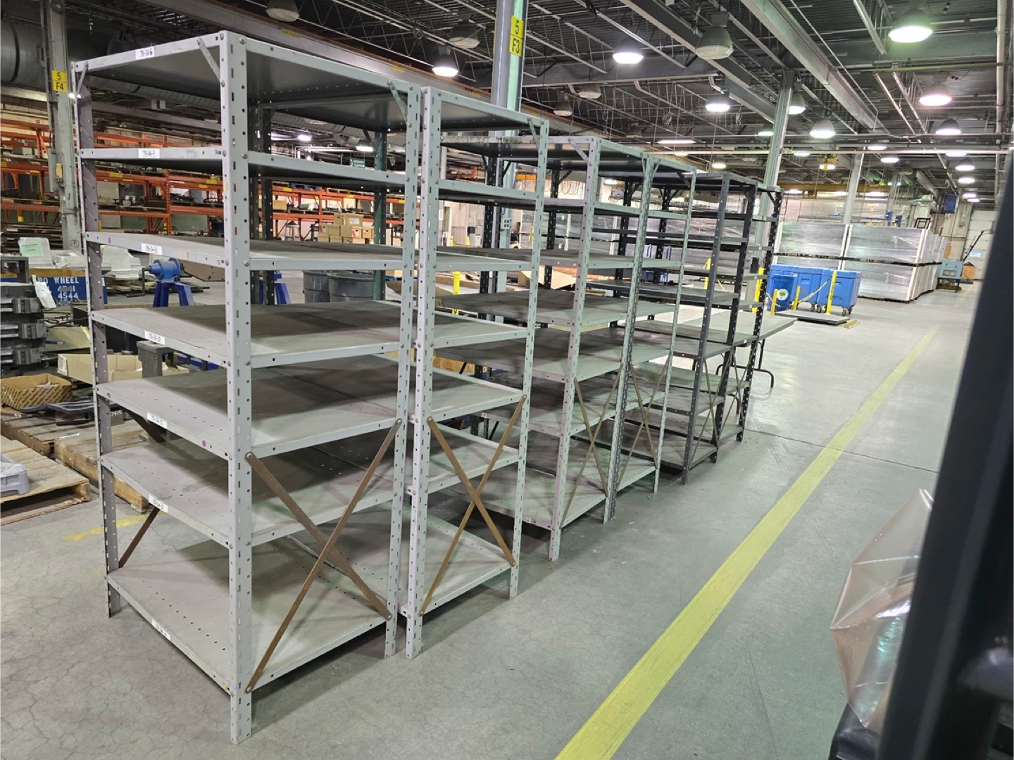 Heavy-duty metal shelving units with tiers, perfect for garages, workshops, or storage rooms. Sturdy construction, grey finish.