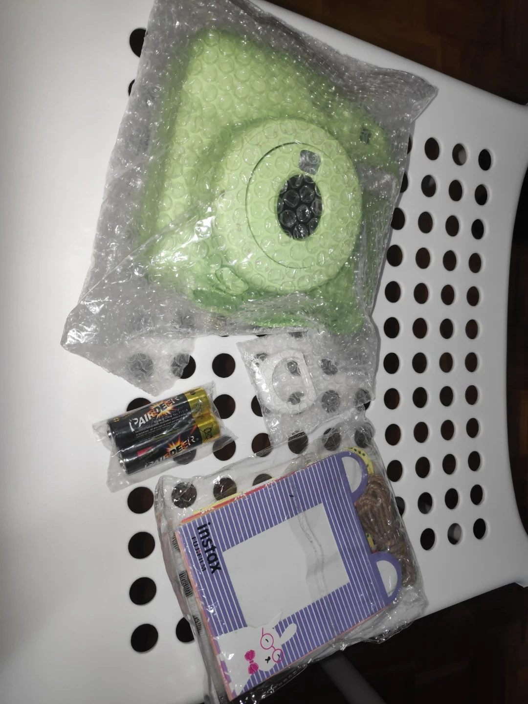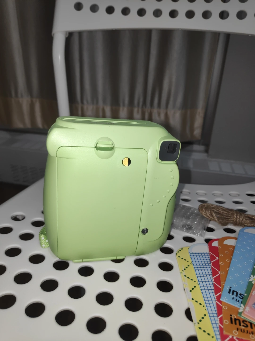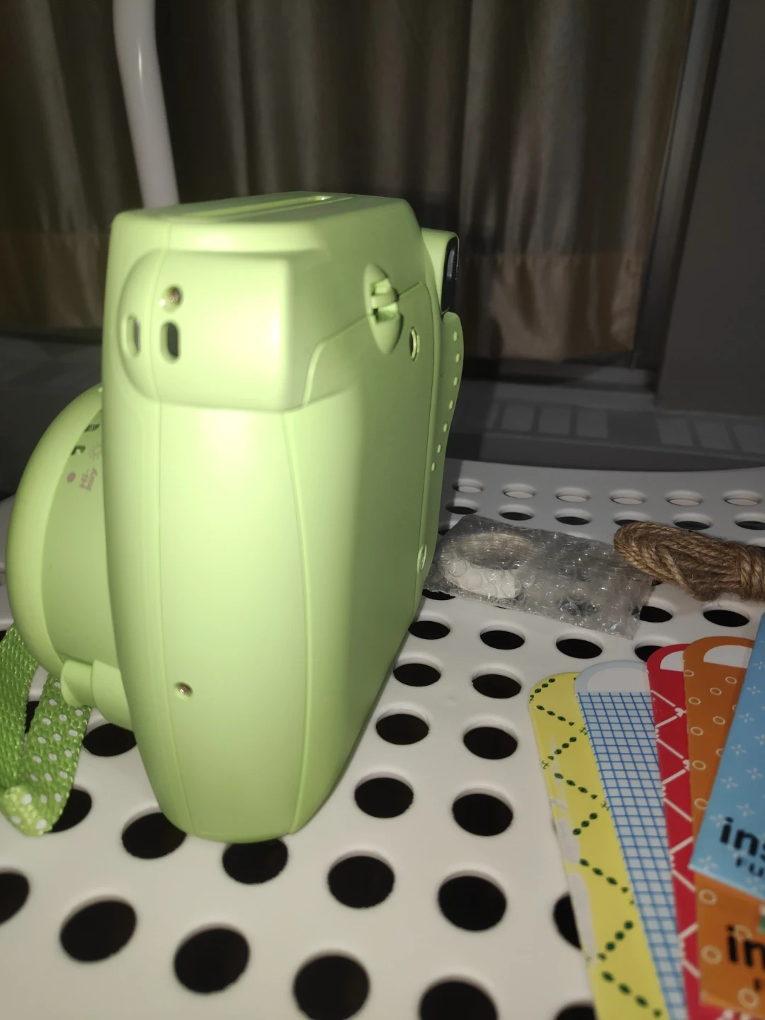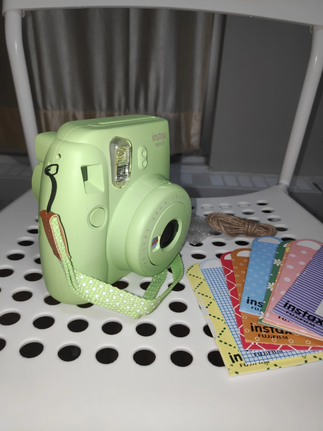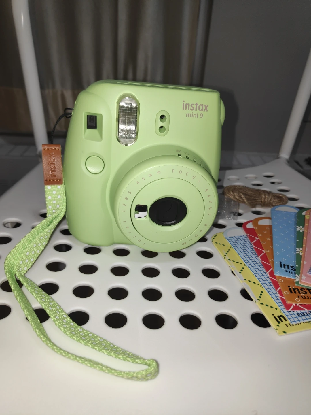 Fujifilm Instax Mini 9 instant camera only with shows items in light green. Comes with a strap and photo display cards. Perfect for capturing memories instantly!