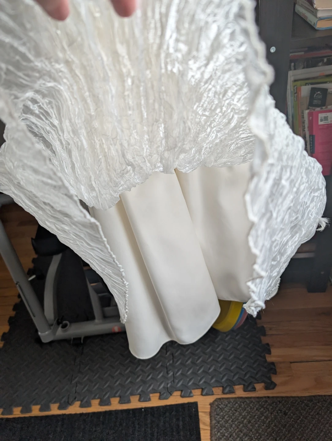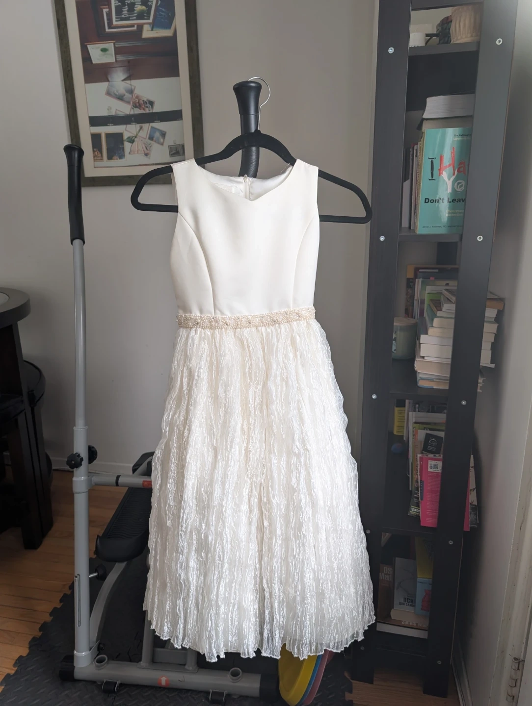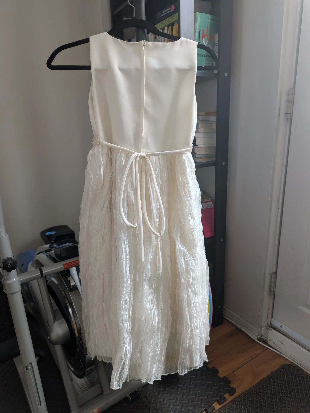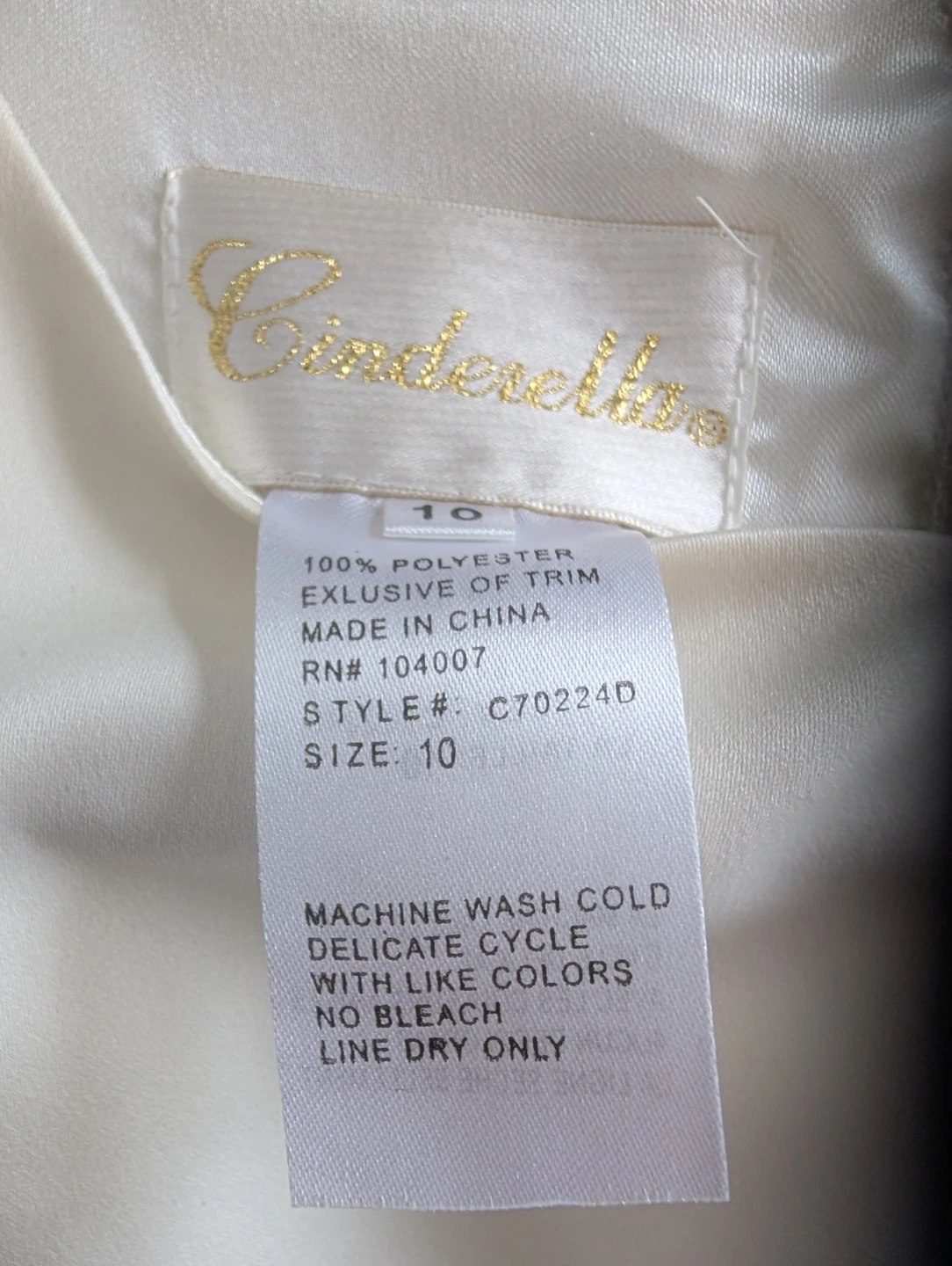 This is a lovely white Cinderella dress with a beaded belt and textured skirt. It's a size 10. The dress is made of 100% polyester and features a tie in the back for a snug fit.