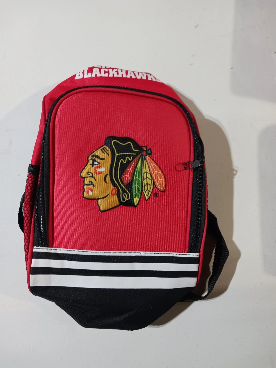 Selling a Chicago Blackhawks mini backpack. Features the team logo and name. Red with black and white stripes at the bottom. Great for small items!