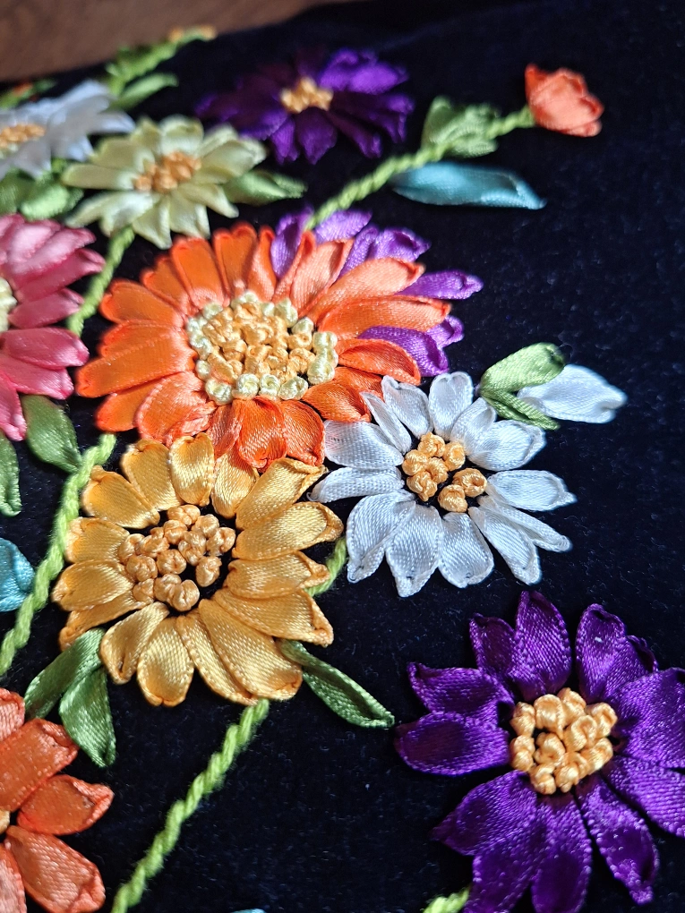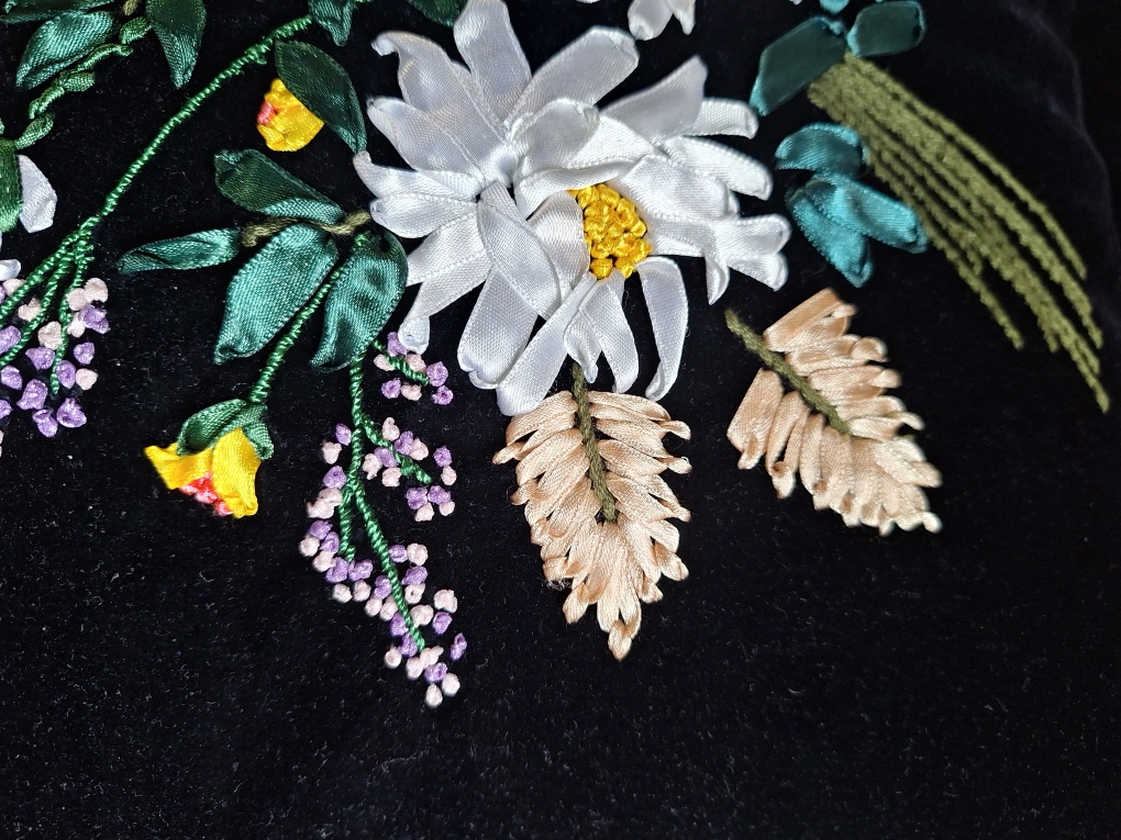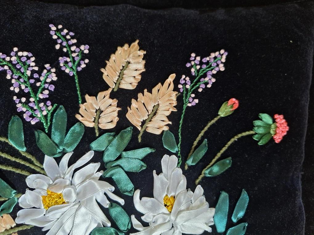 A beautiful floral embroidered throw pillow featuring a lovely design on a black velvet background. It would be a great addition to any living room or bedroom!