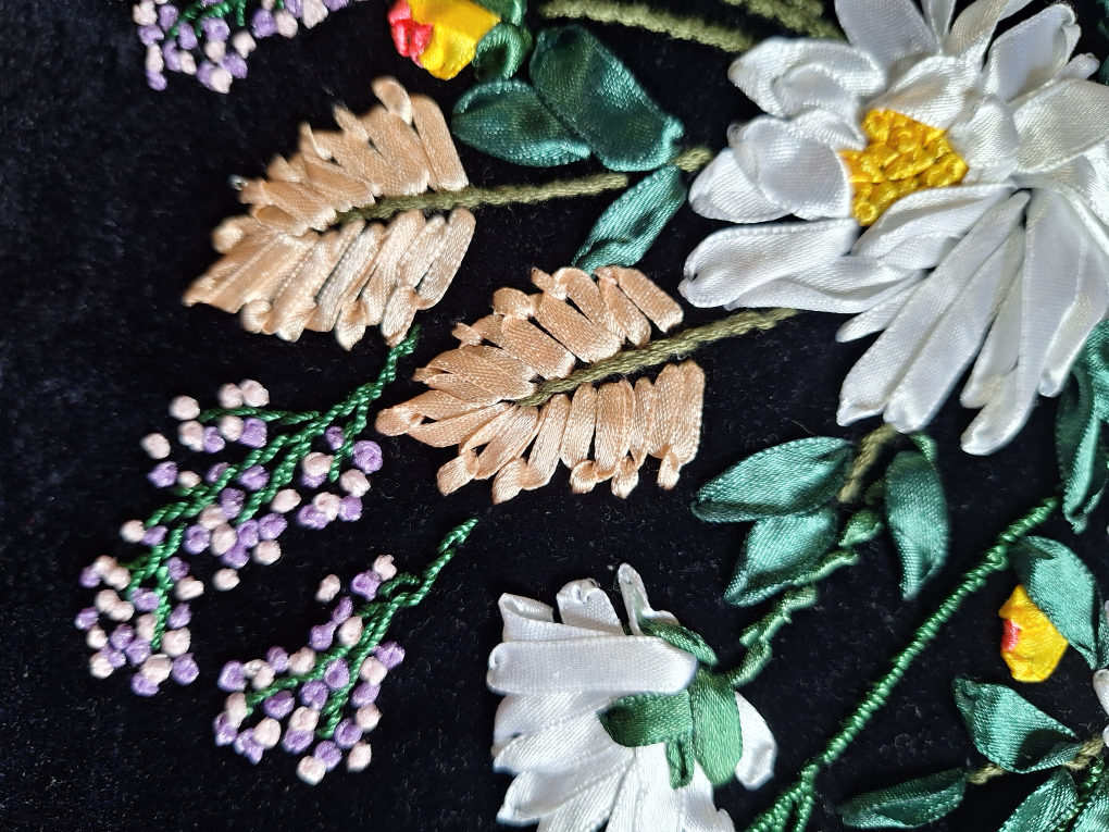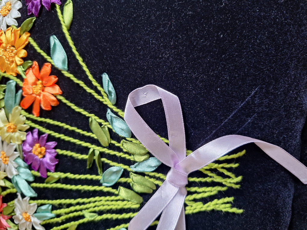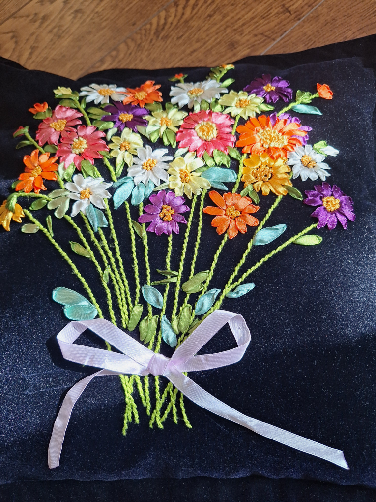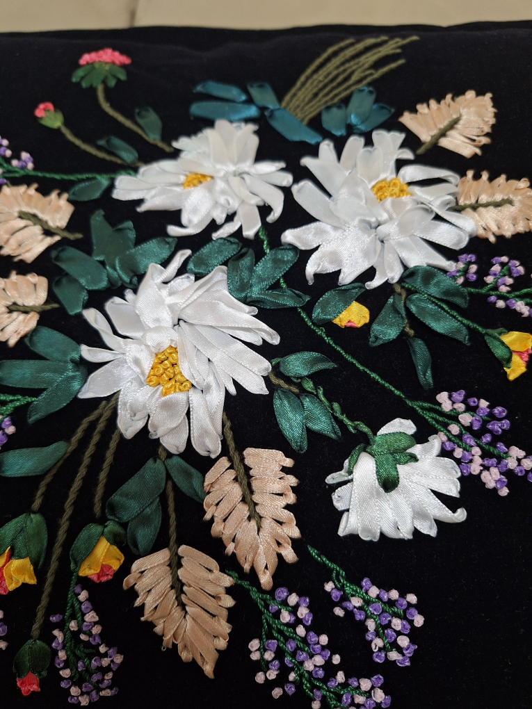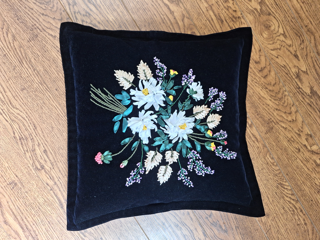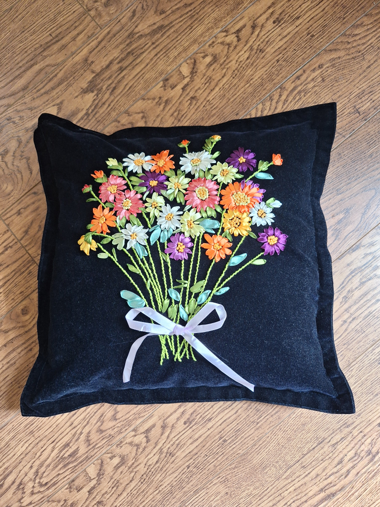 A beautiful floral embroidered throw pillow featuring a lovely design on a black velvet background. It would be a great addition to any living room or bedroom!