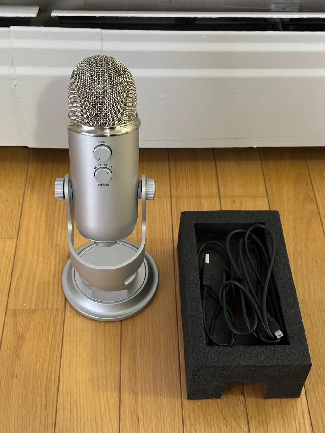 Selling a Blue Yeti USB microphone in silver. It comes with its original box and USB cable. This microphone is great for recording music, podcasts, or streaming. It features a tri-capsule array and four polar pattern selections. Get yours today!