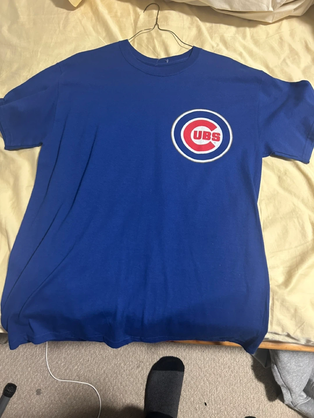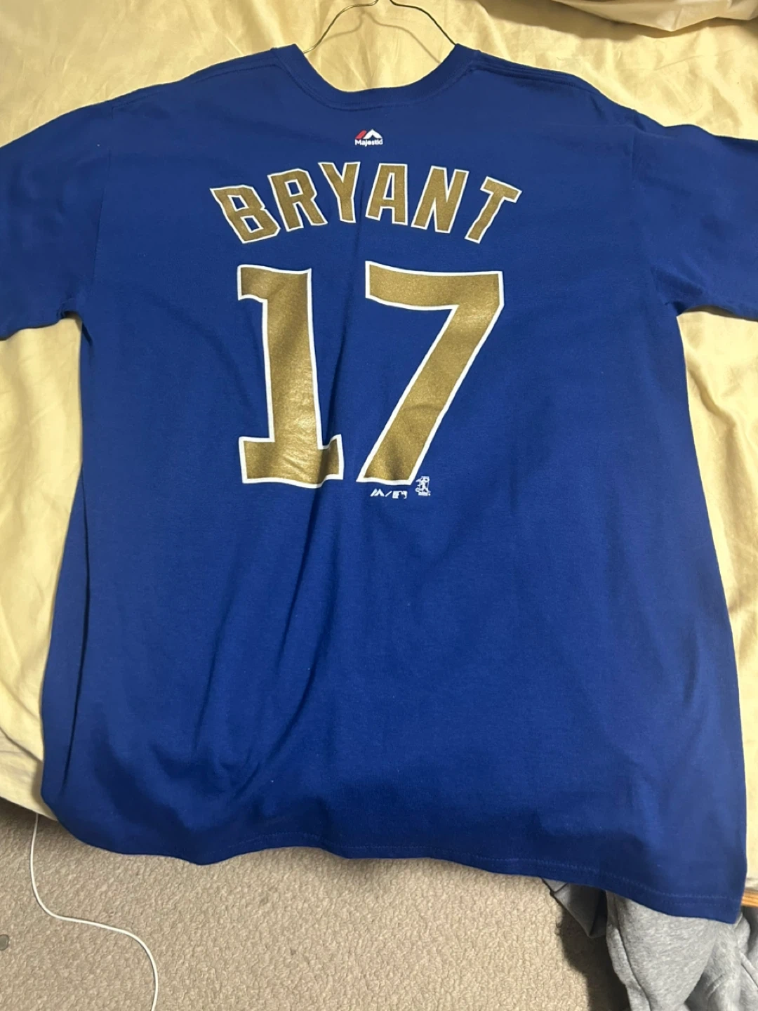 Selling a Majestic Bryant #17 Chicago Cubs T-shirt. It's blue with gold lettering on the back and the Cubs logo on the front. Great for any Cubs fan!
