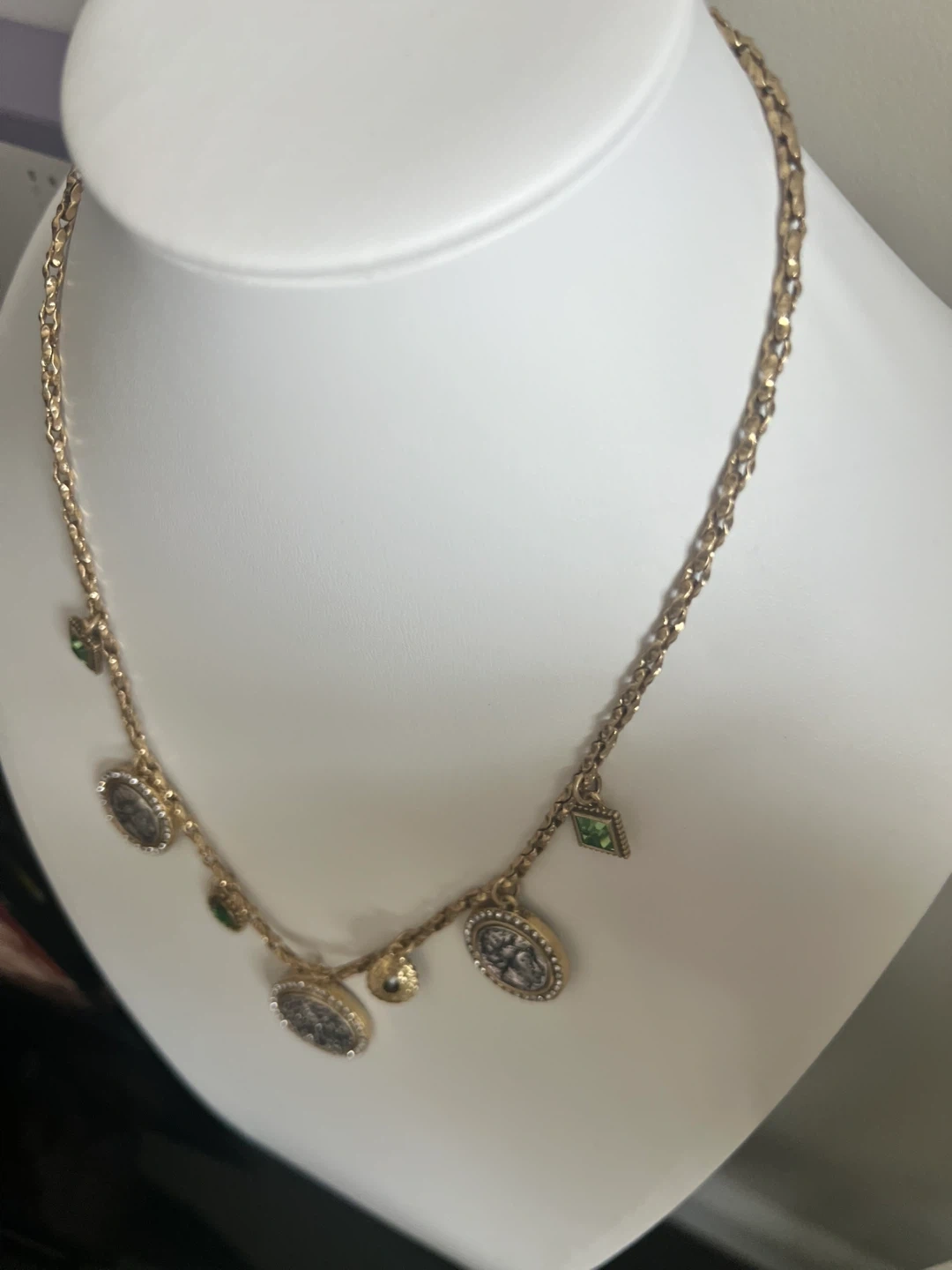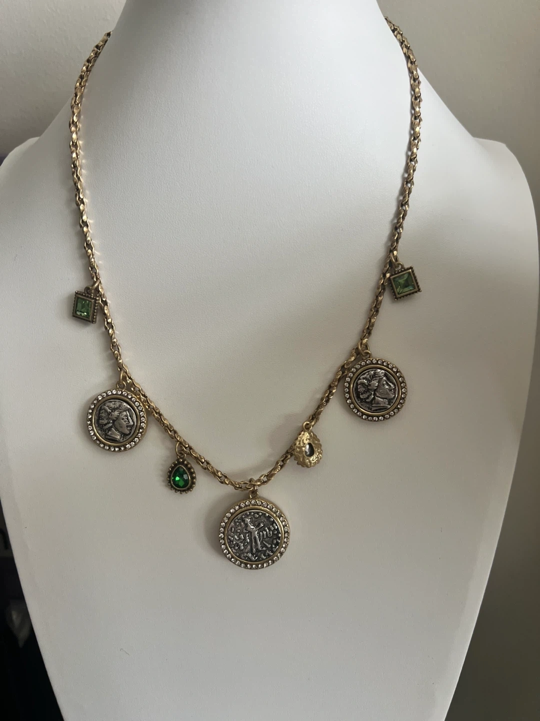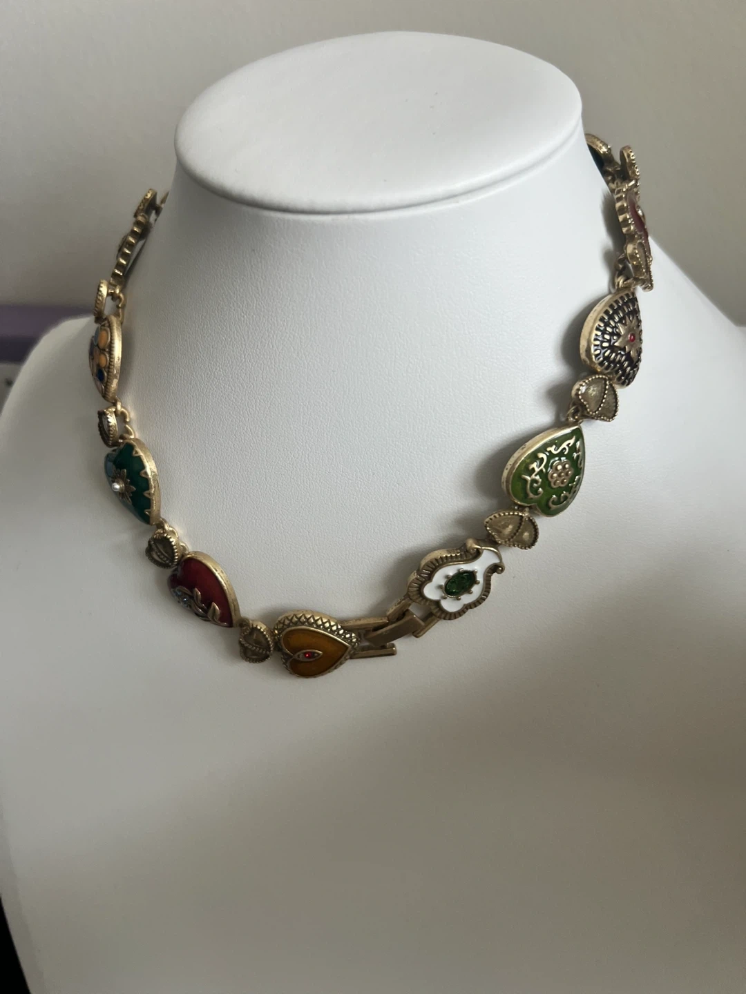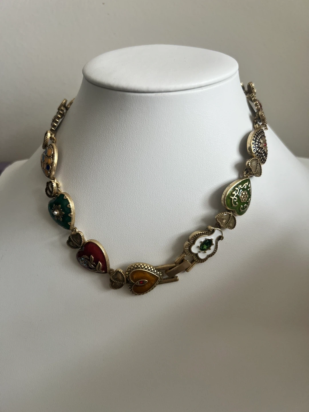 Beautiful gold-tone necklace featuring colourful enamel heart charms with intricate detailing. It also has coin-shaped charms with green jewel accents. It's a unique statement piece that adds a pop of colour to any outfit!