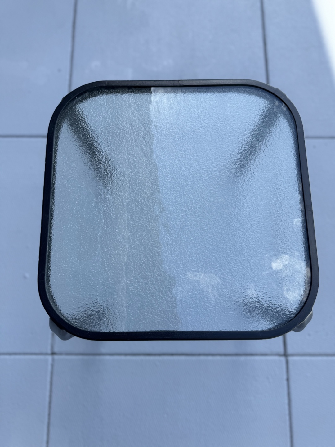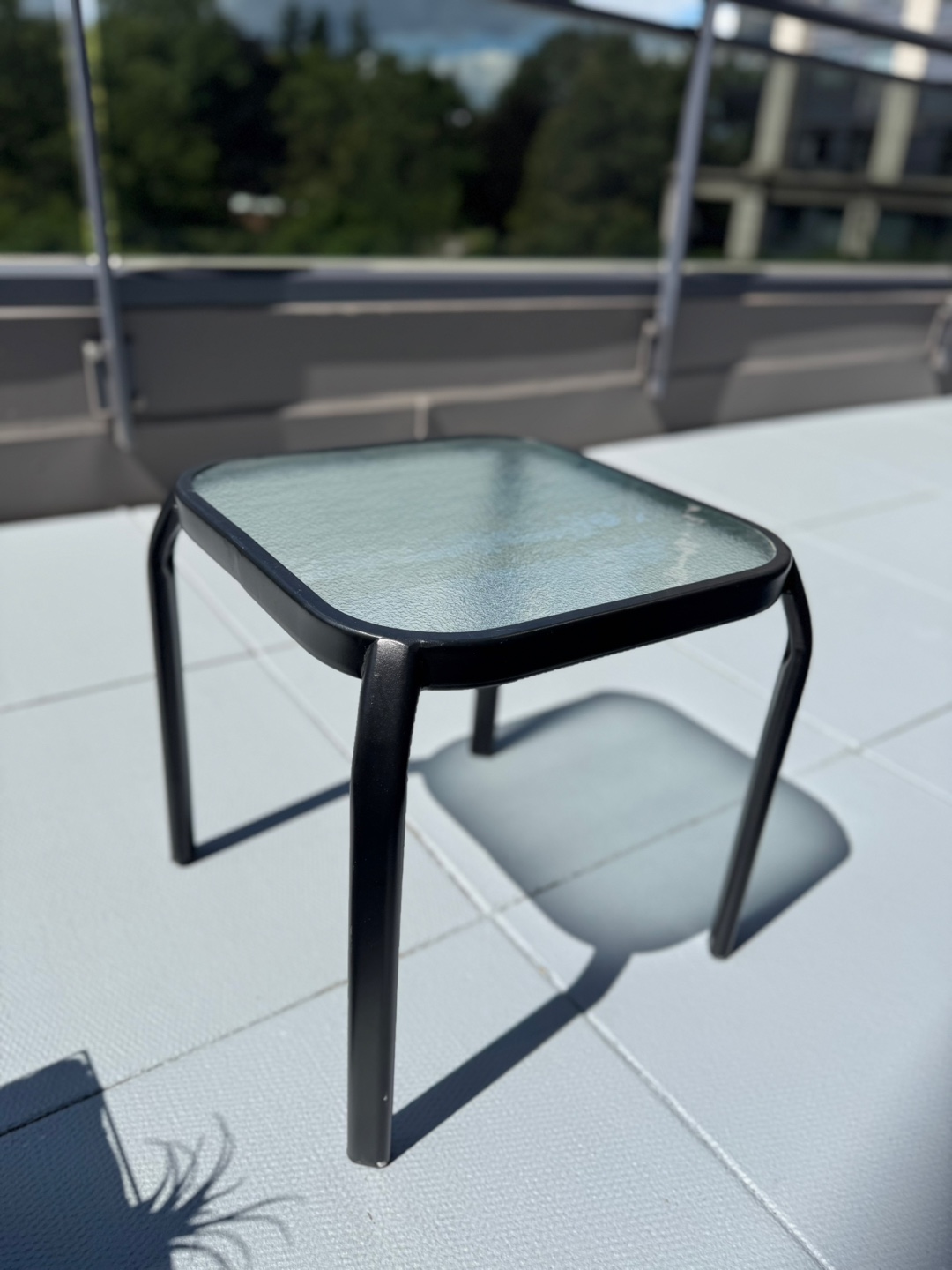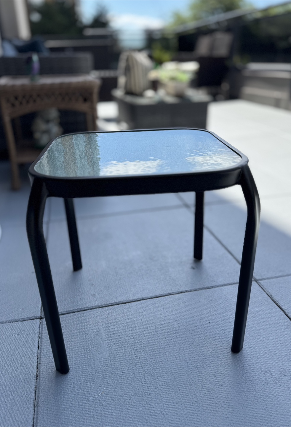 This outdoor side table is perfect for your patio or balcony! It features a sleek black frame and a stylish glass top. It's in great condition and ready to add some functionality to your outdoor space