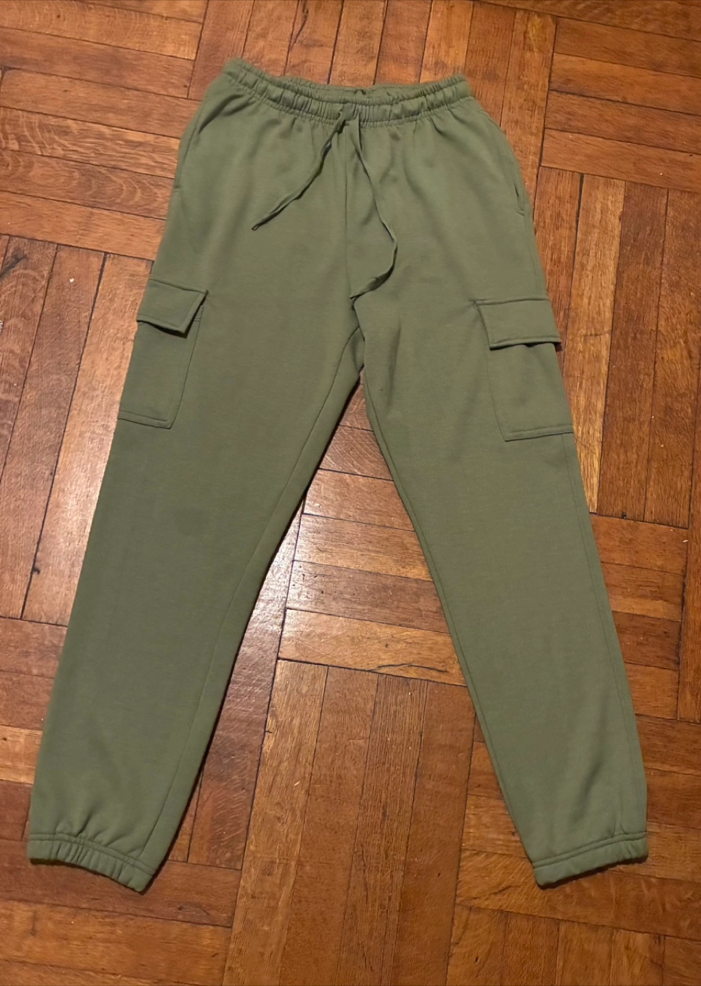Free pair of comfortable cargo sweatpants in olive green. Great for lounging around or running errands!