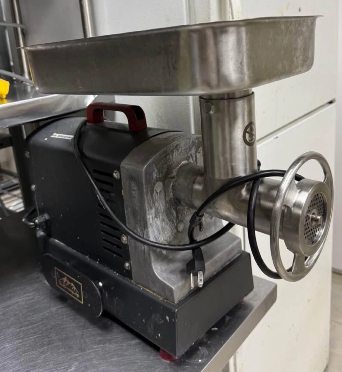 Heavy-duty electric meat grinder. Stainless steel construction. Includes food tray. Used condition, good as new