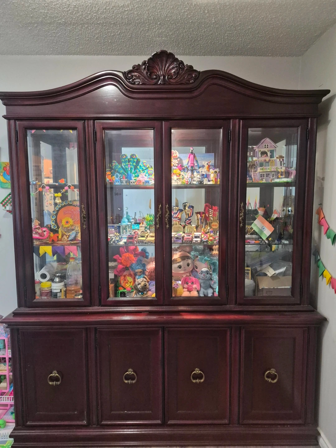 This 2 piece Hutch and Buffet cabinet is a large wooden display cabinet with glass doors and interior shelving. It's perfect for showcasing collectibles or books. The dark wood finish complements most home decor styles.