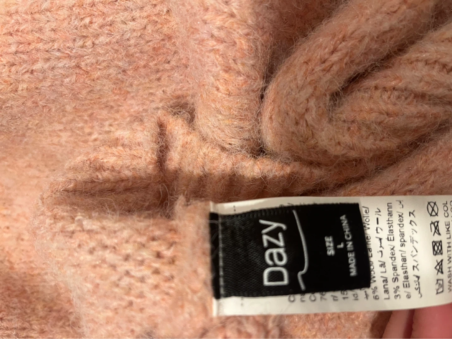 This is a Dazy turtleneck sweater in a light pink colour. Made with 6% wool and 3% spandex. It's a size large. This sweater is perfect for staying warm and cozy on cooler days!