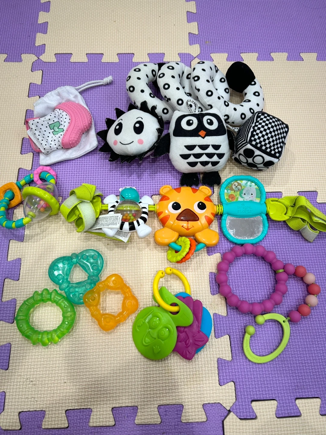 Great for sensory development and keeping your little one entertained. Includes teethers, rattles, and hanging toys for carseat and stroller.