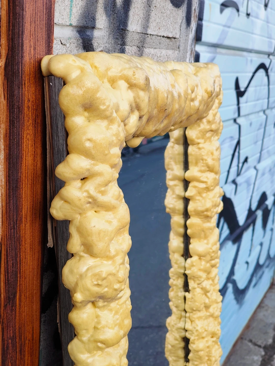 This is a full-length mirror with a distinctive yellow foam frame. The frame is applied over a wooden backing. It's a unique piece that'll make a statement in any room! Adds a quirky touch to your decor.