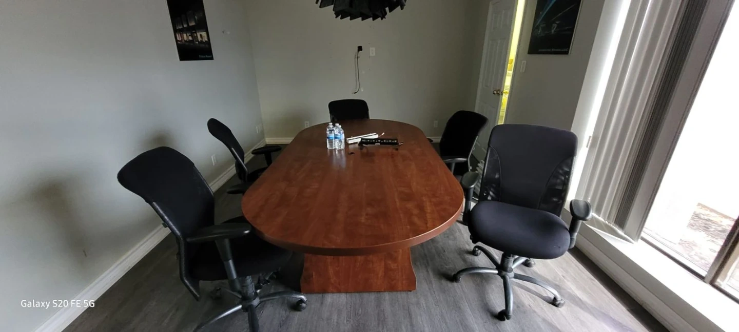 This conference table set includes a beautiful wooden oval table and six matching black office chairs. The chairs offer comfortable seating with adjustable height and wheels. Perfect for your office meeting room!