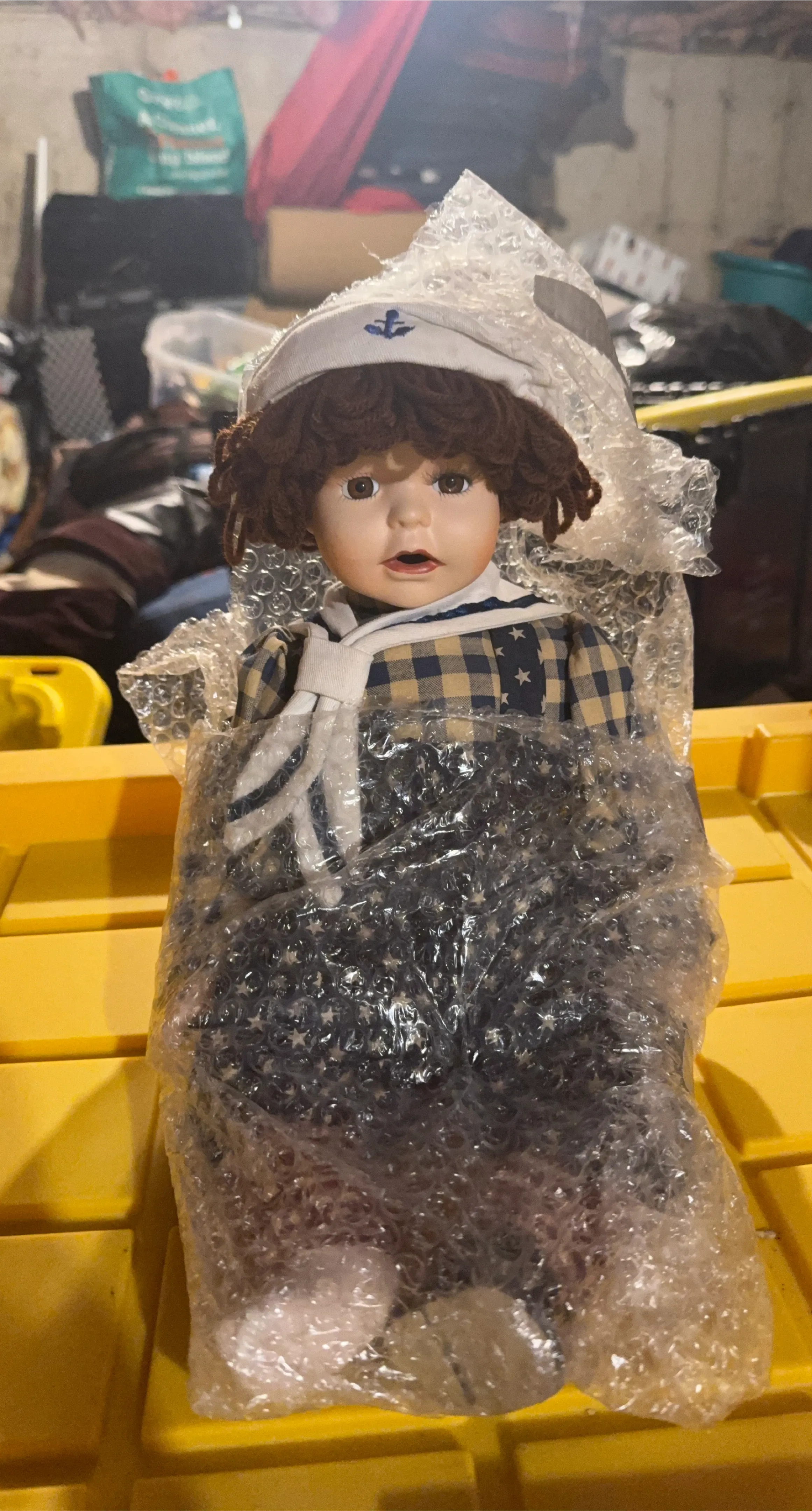 Here is a porcelain doll dressed in a sailor outfit. It's still wrapped in bubble wrap for protection. The doll has brown curly hair and brown eyes, and is wearing a white sailor hat with a blue anchor emblem.