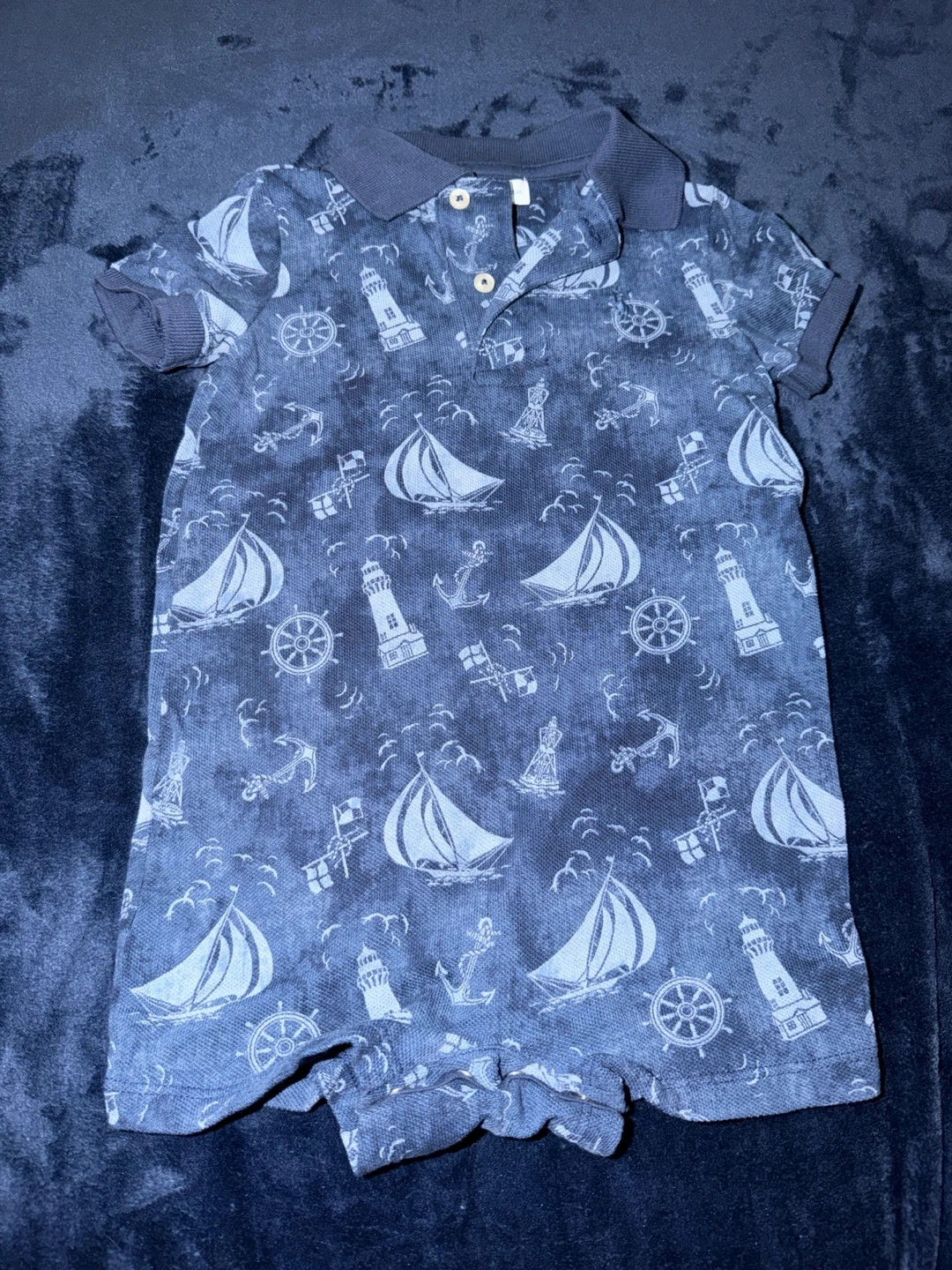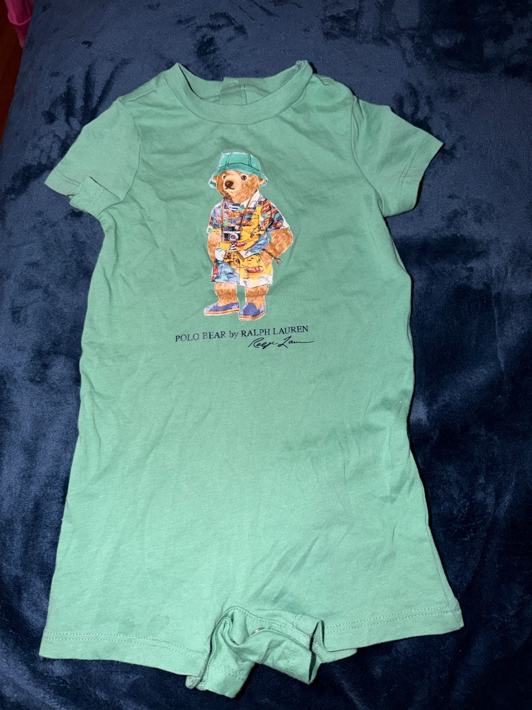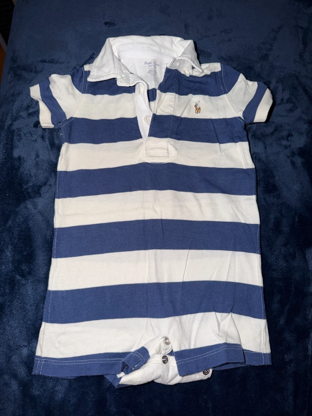 Includes three striped rompers, one color-blocked romper, and one light blue romper with a bear graphic. All are short-sleeved with polo collars and snap closures. Made of cotton.