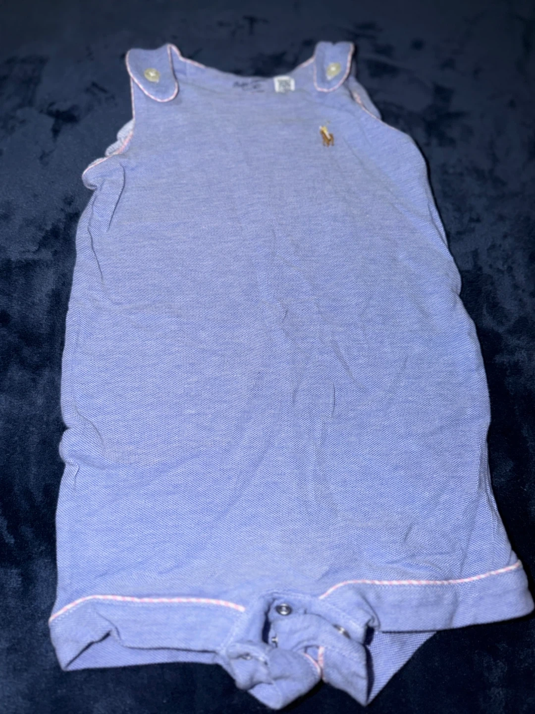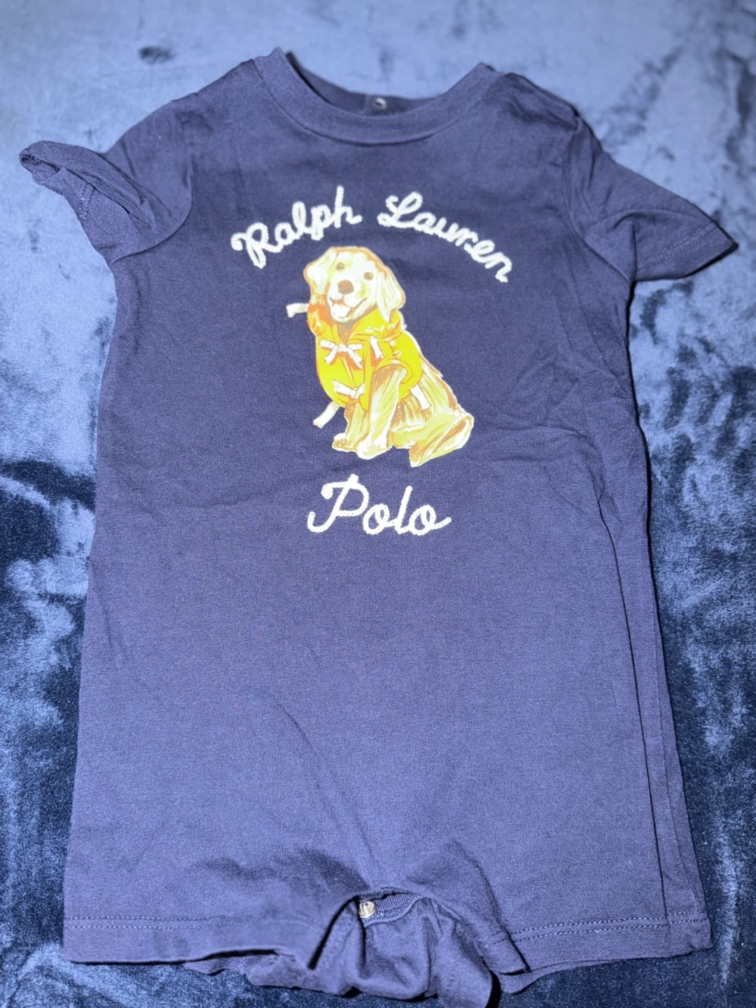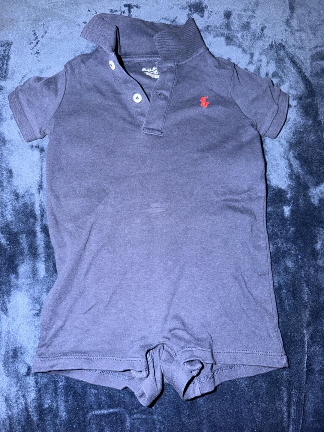 Includes three striped rompers, one color-blocked romper, and one light blue romper with a bear graphic. All are short-sleeved with polo collars and snap closures. Made of cotton.