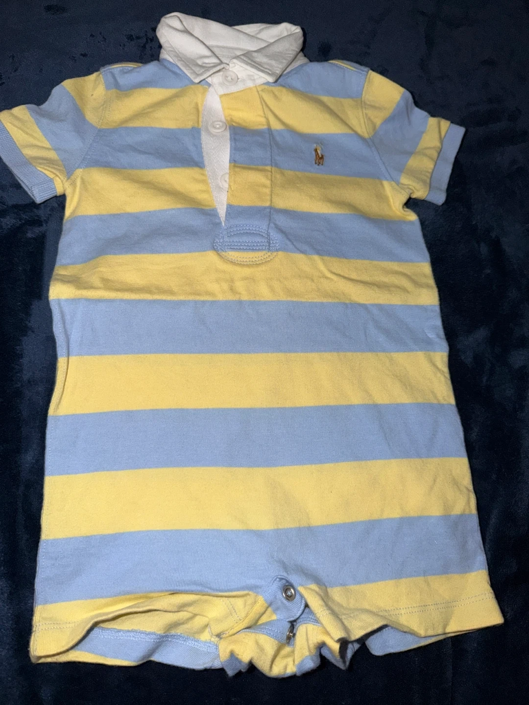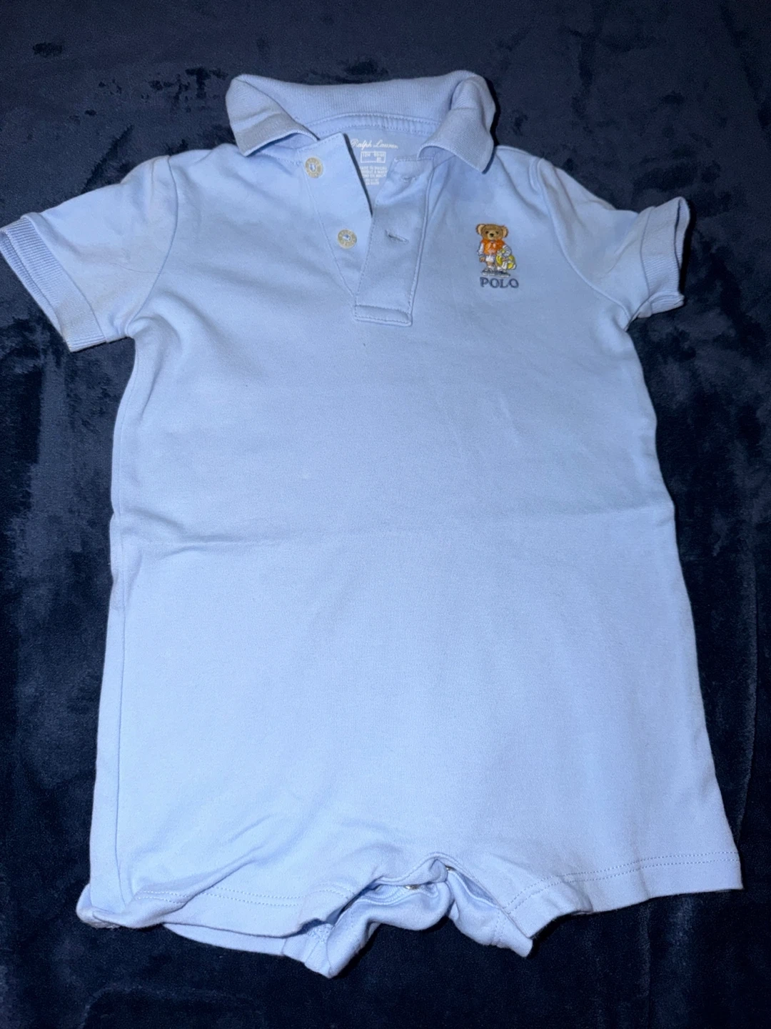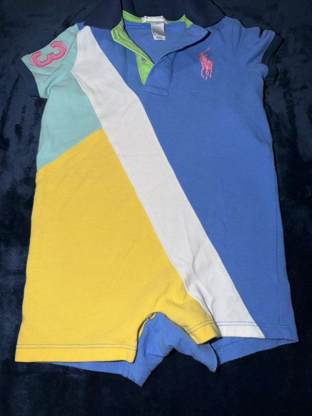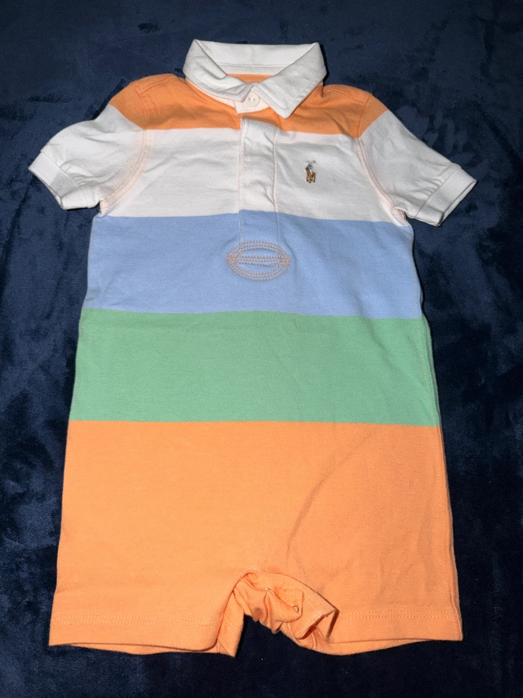Includes three striped rompers, one color-blocked romper, and one light blue romper with a bear graphic. All are short-sleeved with polo collars and snap closures. Made of cotton.