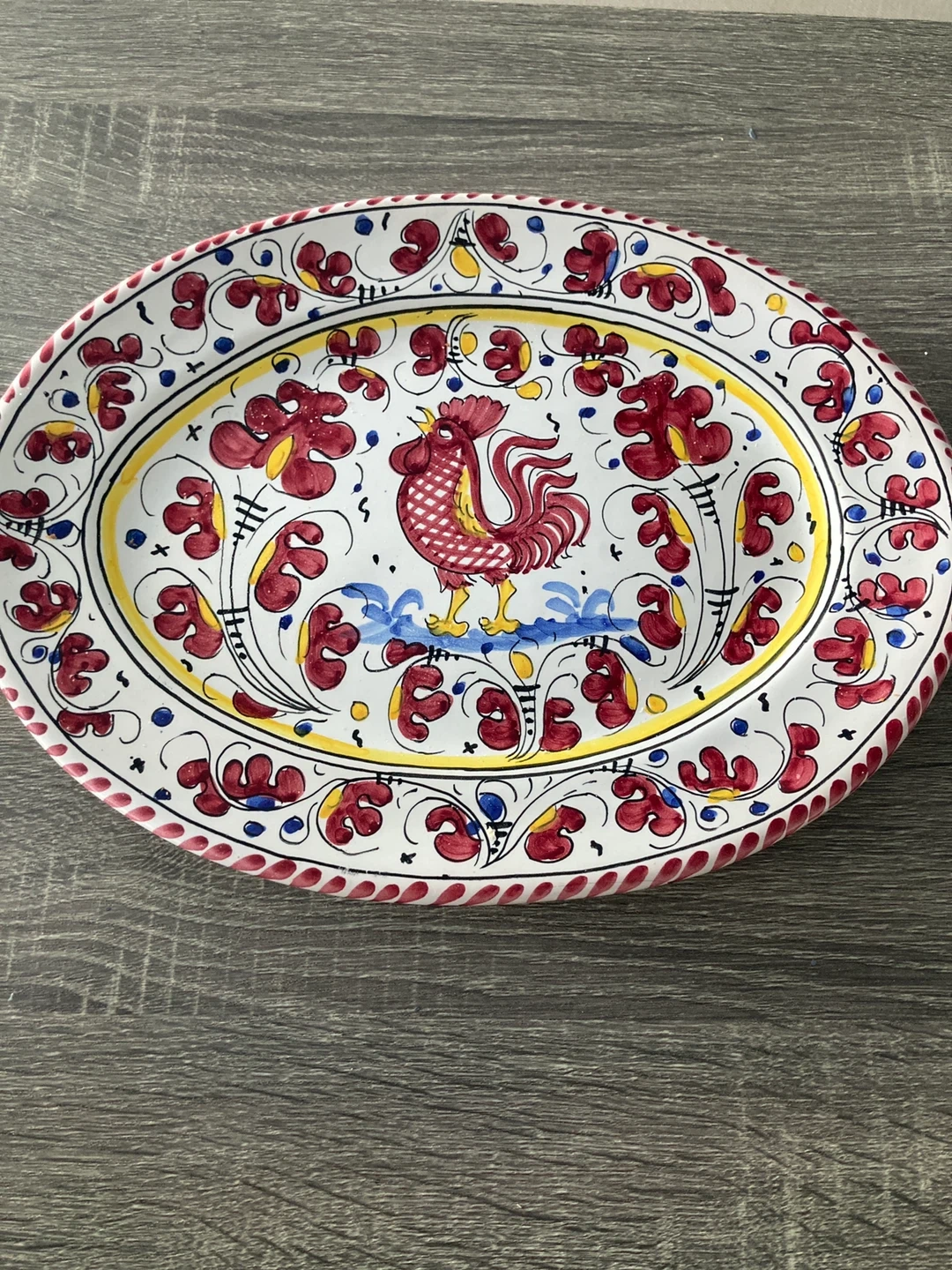 Decorative oval platter featuring a vibrant hand-painted rooster design. Ceramic construction. Measures approximately 13 inches long.
