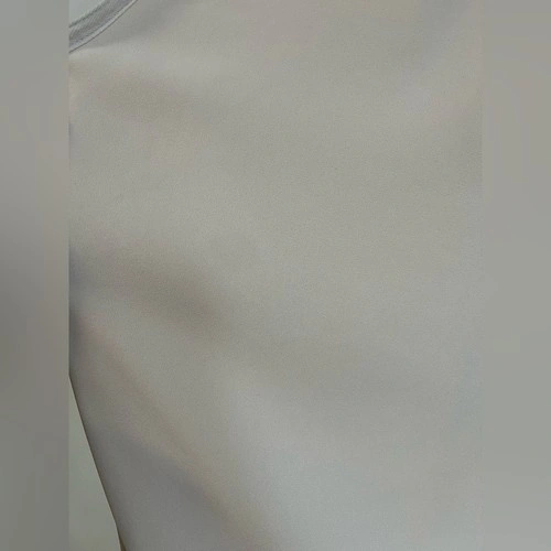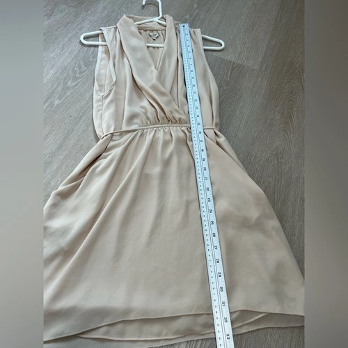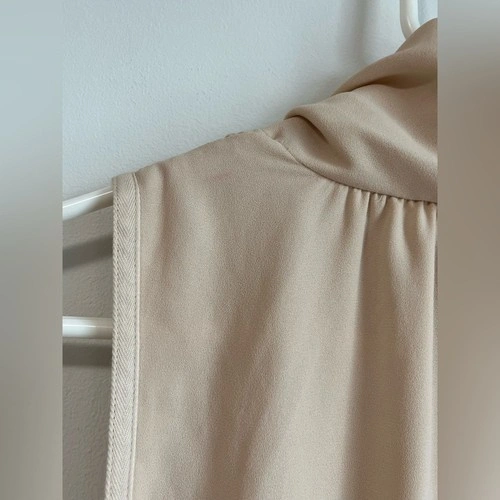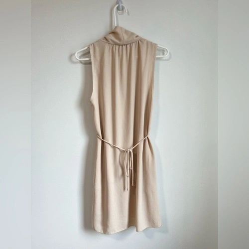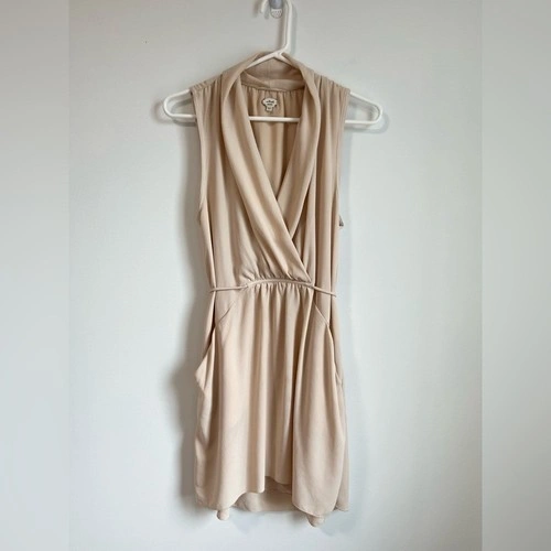 Very small mark on back collar/slight discoloration as shown. In otherwise good pre-owned condition. This is a sleeveless dress with a faux-wrap front and self-tie detail at the waist. It's made with a Japanese fabric that drapes nicely.