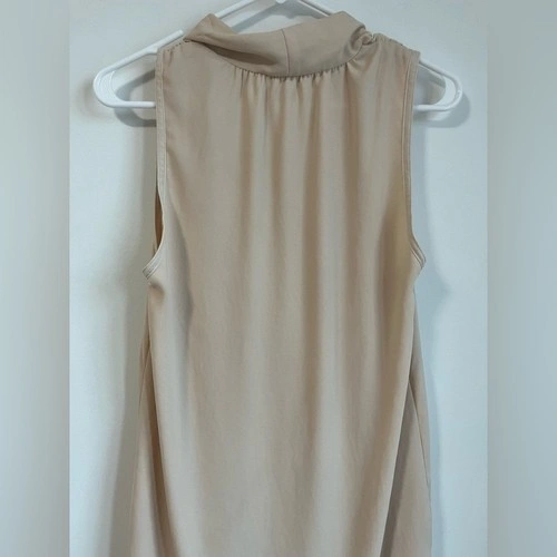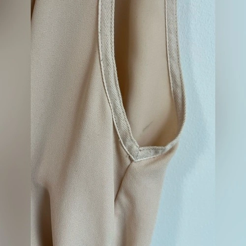 Very small mark on back collar/slight discoloration as shown. In otherwise good pre-owned condition. This is a sleeveless dress with a faux-wrap front and self-tie detail at the waist. It's made with a Japanese fabric that drapes nicely.