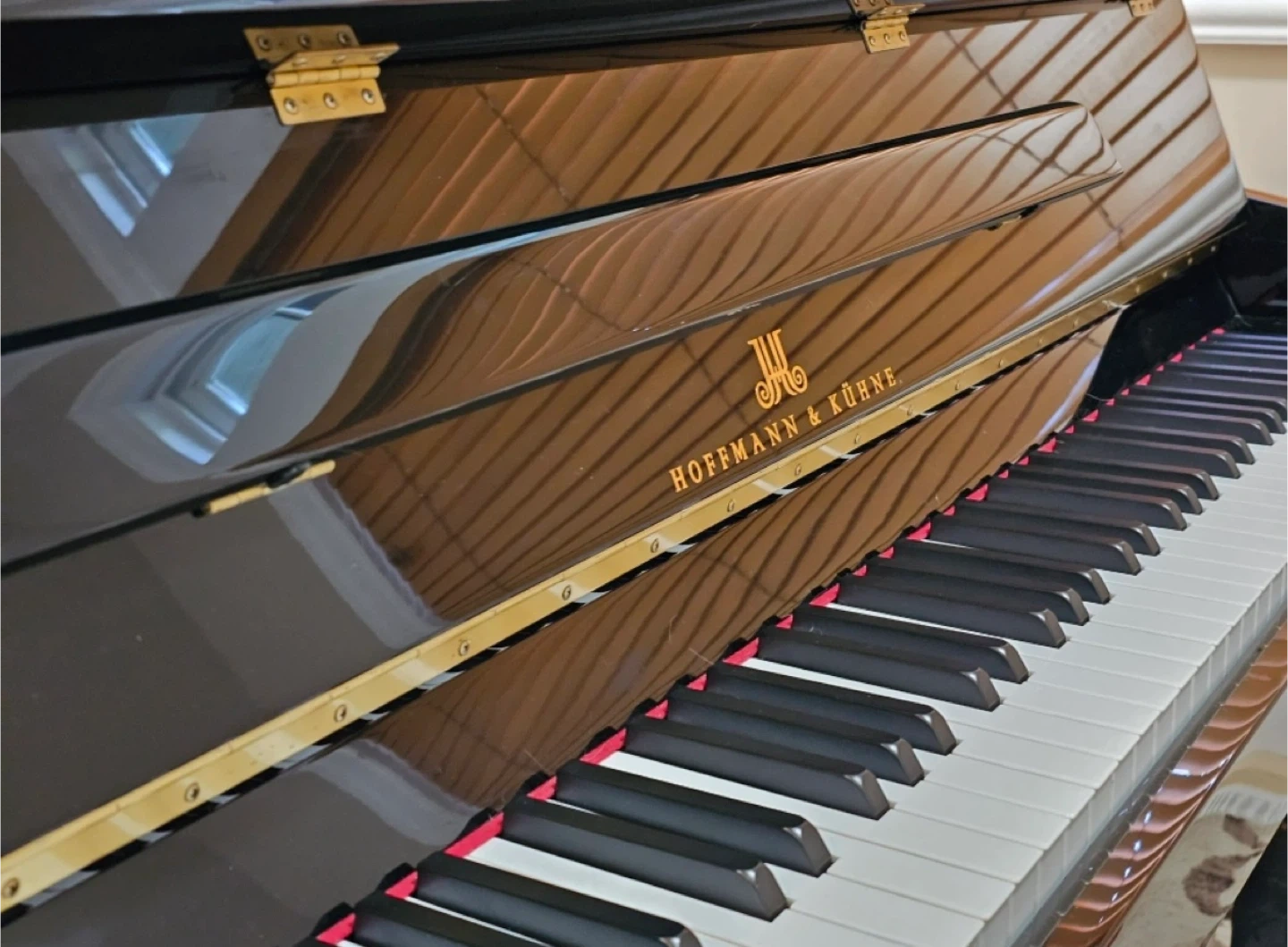 Hoffmann & Kühne upright piano. It's a black, polished finish. Includes matching bench. Great for music students!
