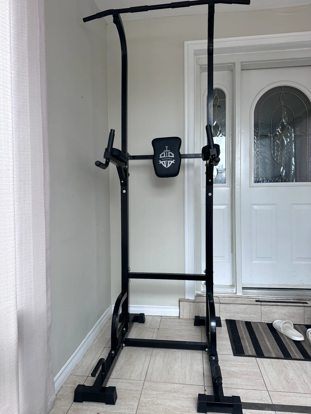 This black pull-up and dip station tower is a versatile piece of home gym equipment. It's constructed from durable steel for stability. This tower offers multiple workout stations for a full-body routine.