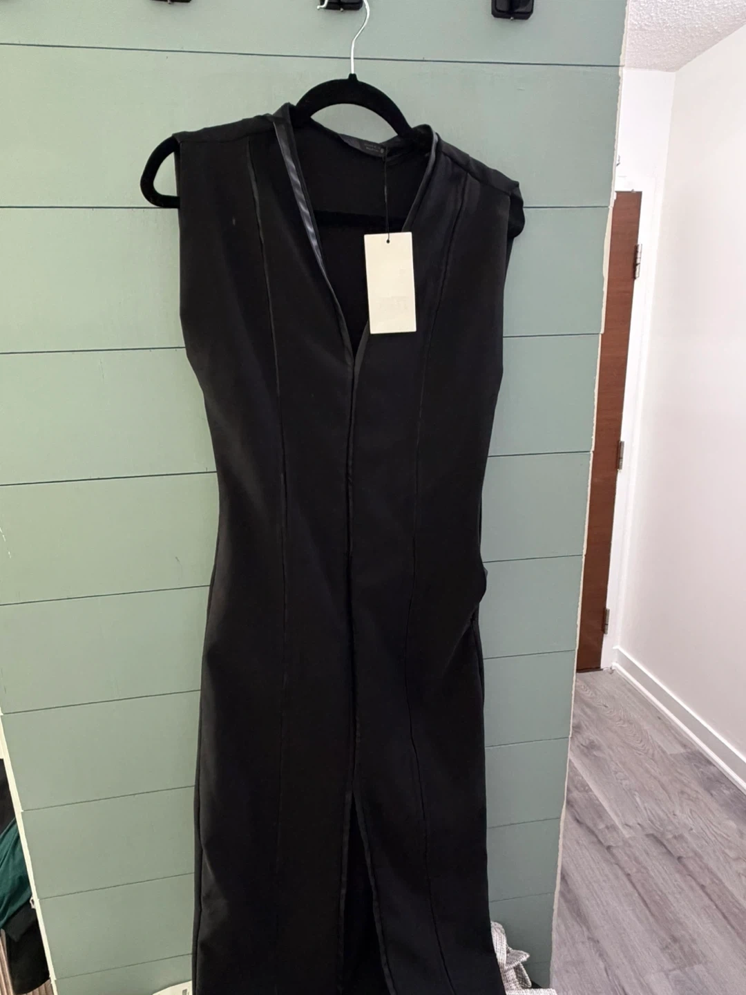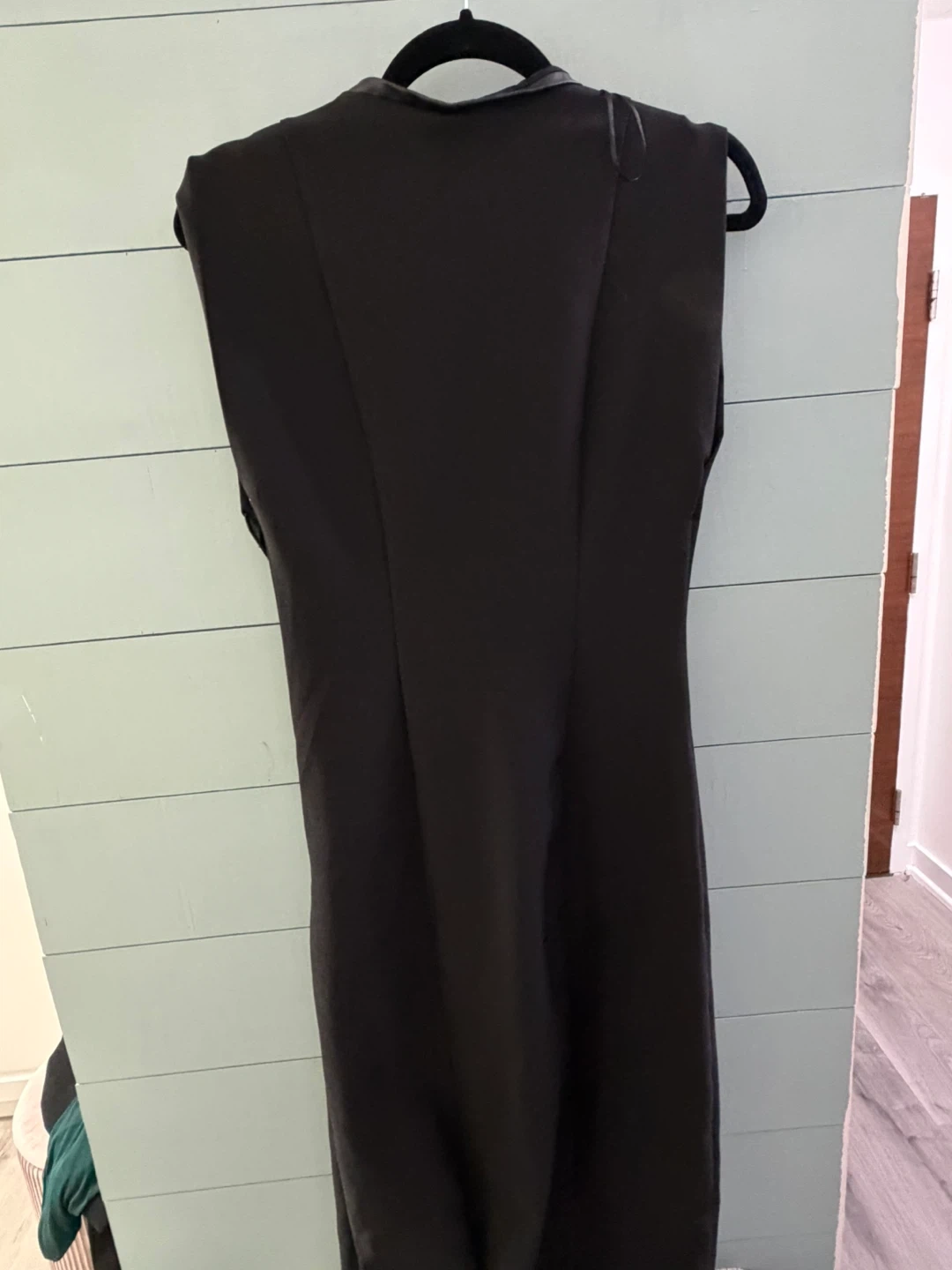 A stylish black sleeveless dress featuring faux leather trim details. It has a V-neckline and a front slit for added flair. This dress offers a sleek silhouette perfect for dressing up.