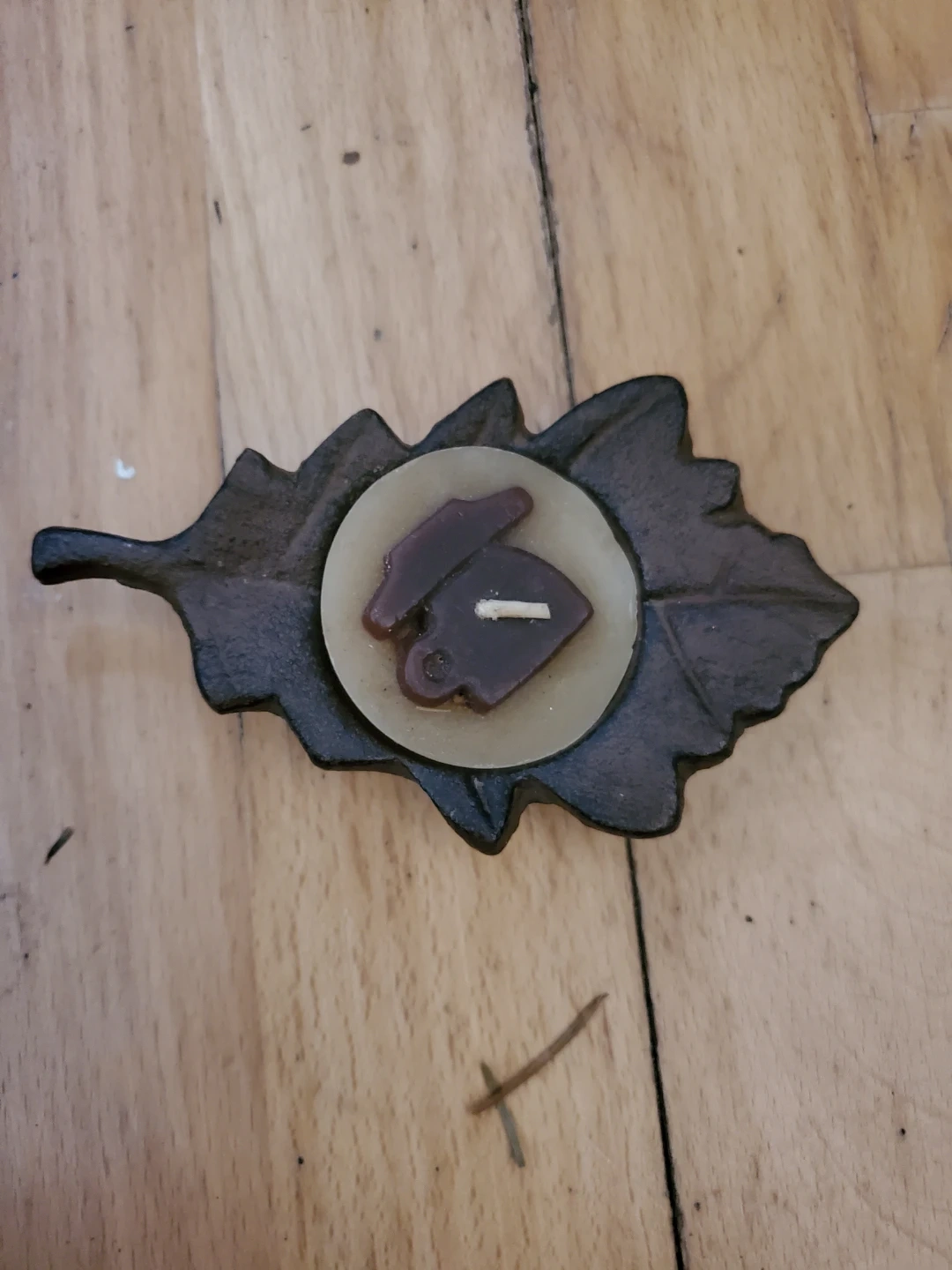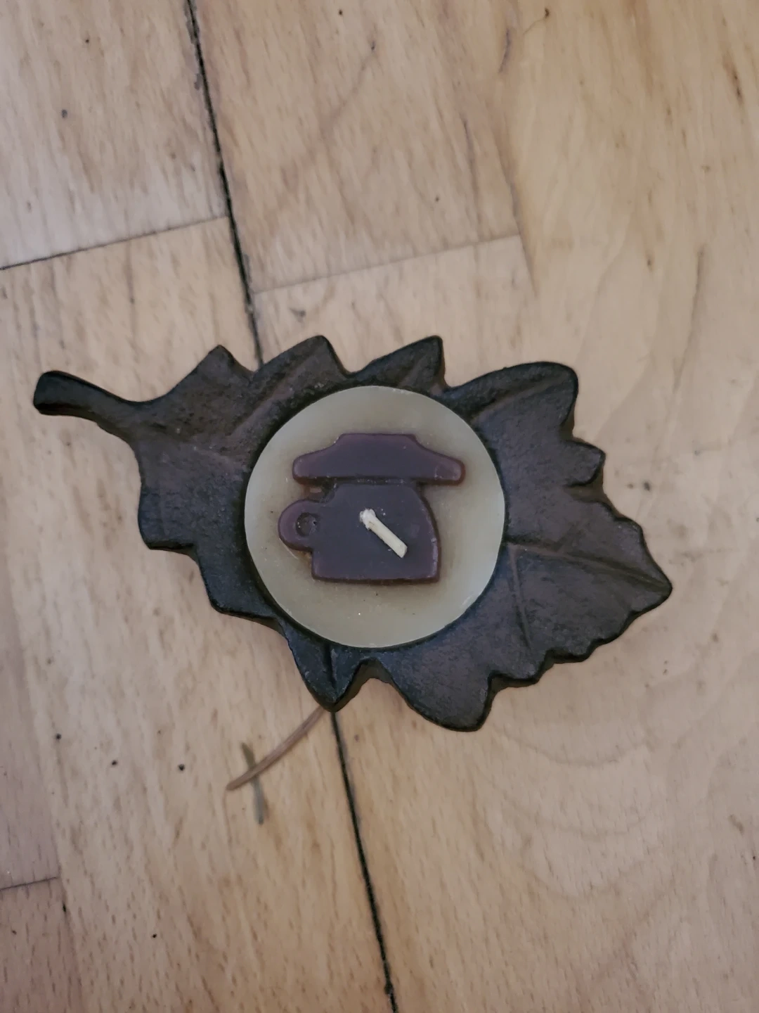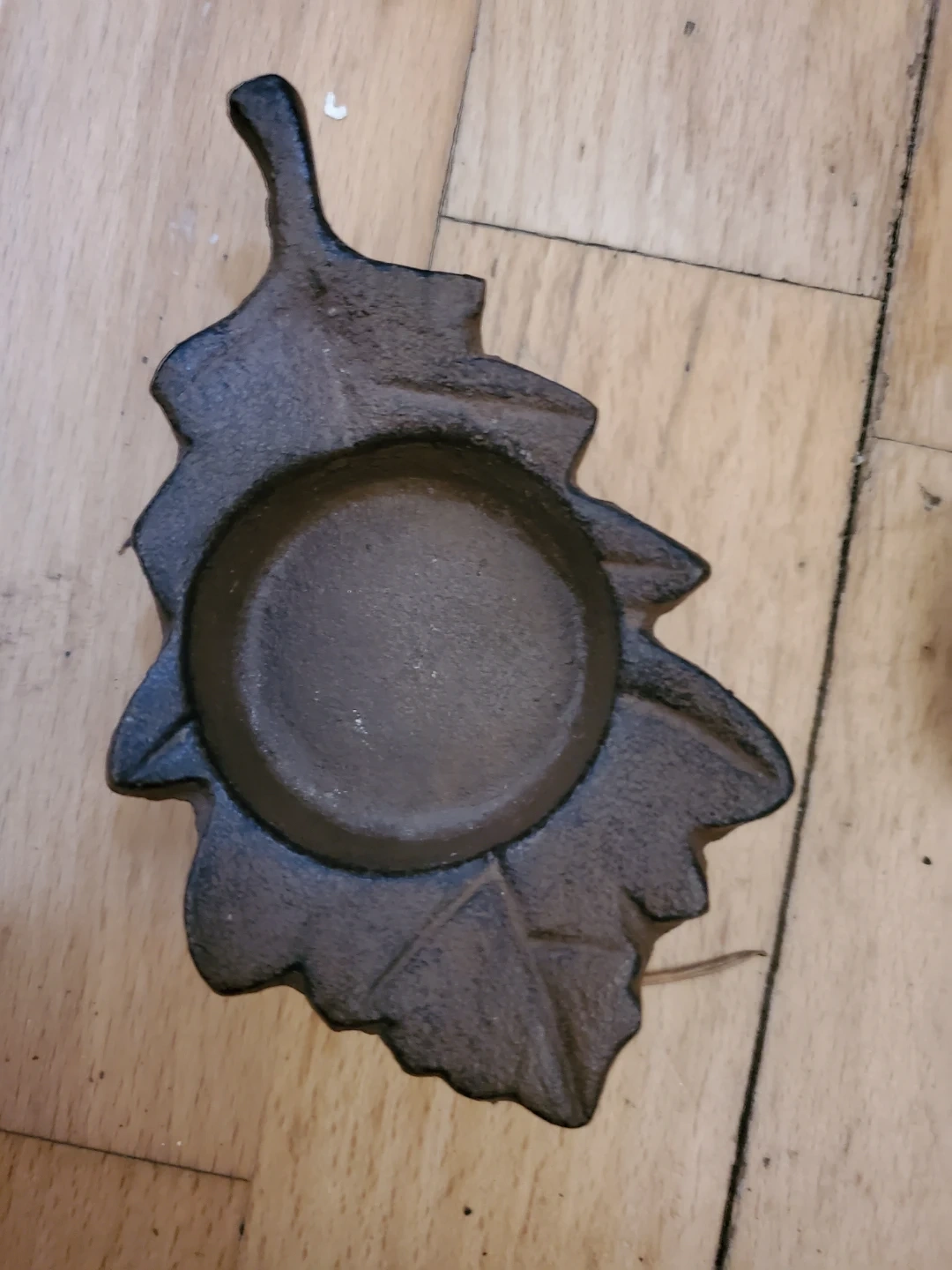 This is a cute leaf-shaped candle holder! It's perfect for adding a touch of nature to your home decor. Cedar pick up. Holder is metal.