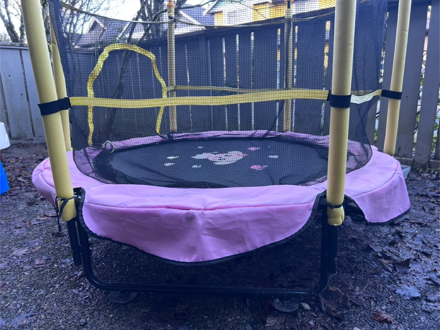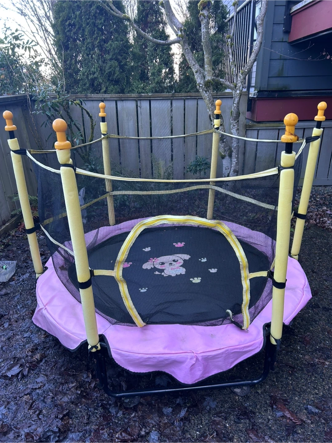 Pink children's trampoline has a black safety enclosure net and yellow foam-covered poles. Jumping mat is black with a cute puppy and paw print graphic. Frame is sturdy black metal with a circular design.