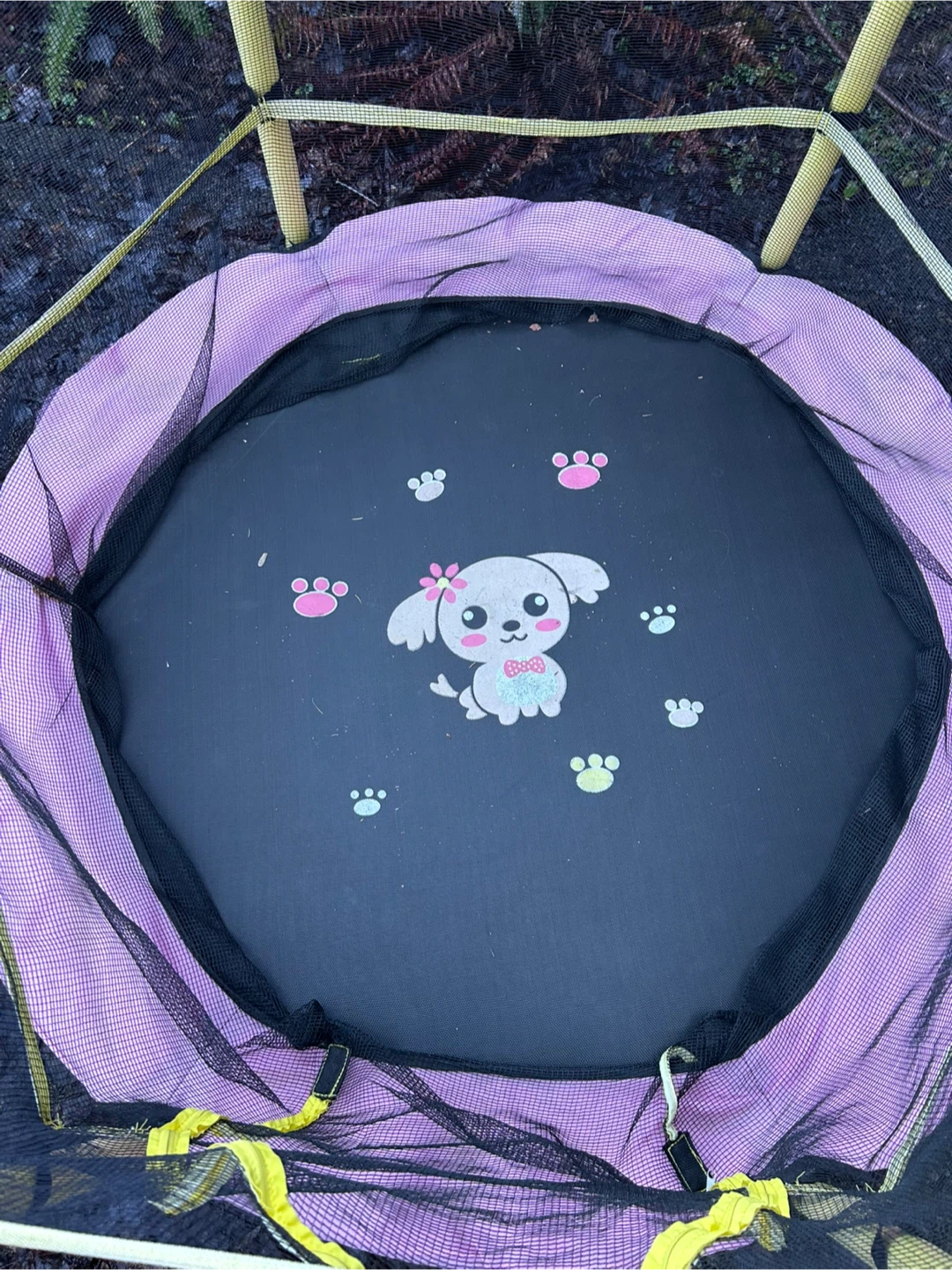 Pink children's trampoline has a black safety enclosure net and yellow foam-covered poles. Jumping mat is black with a cute puppy and paw print graphic. Frame is sturdy black metal with a circular design.