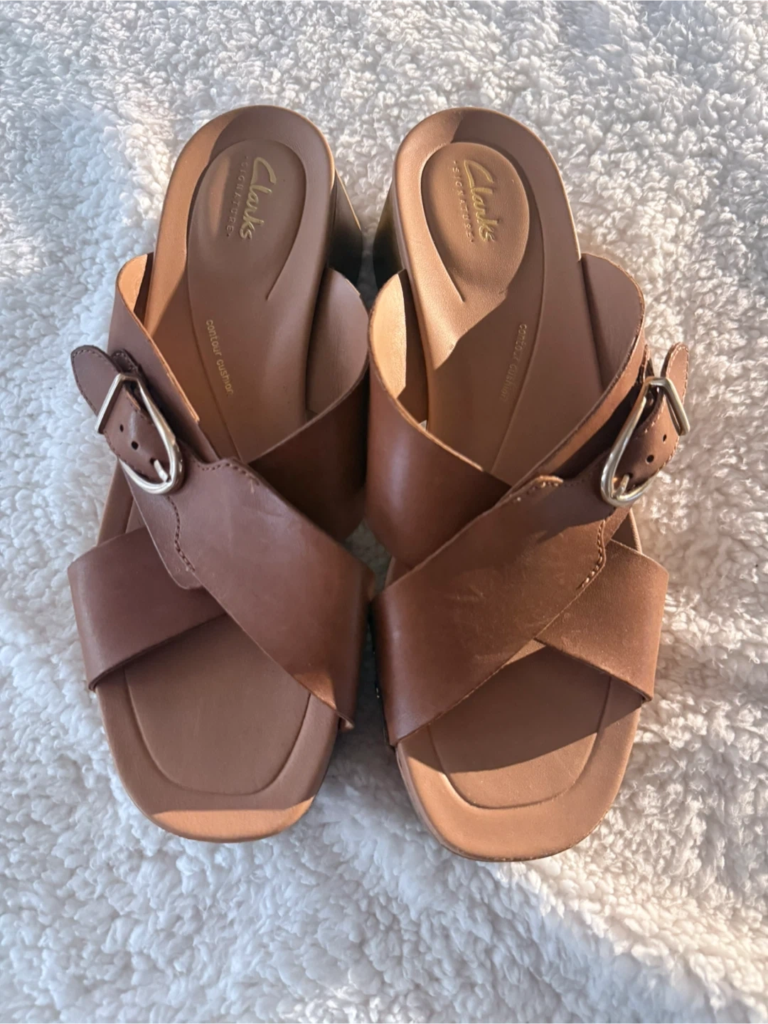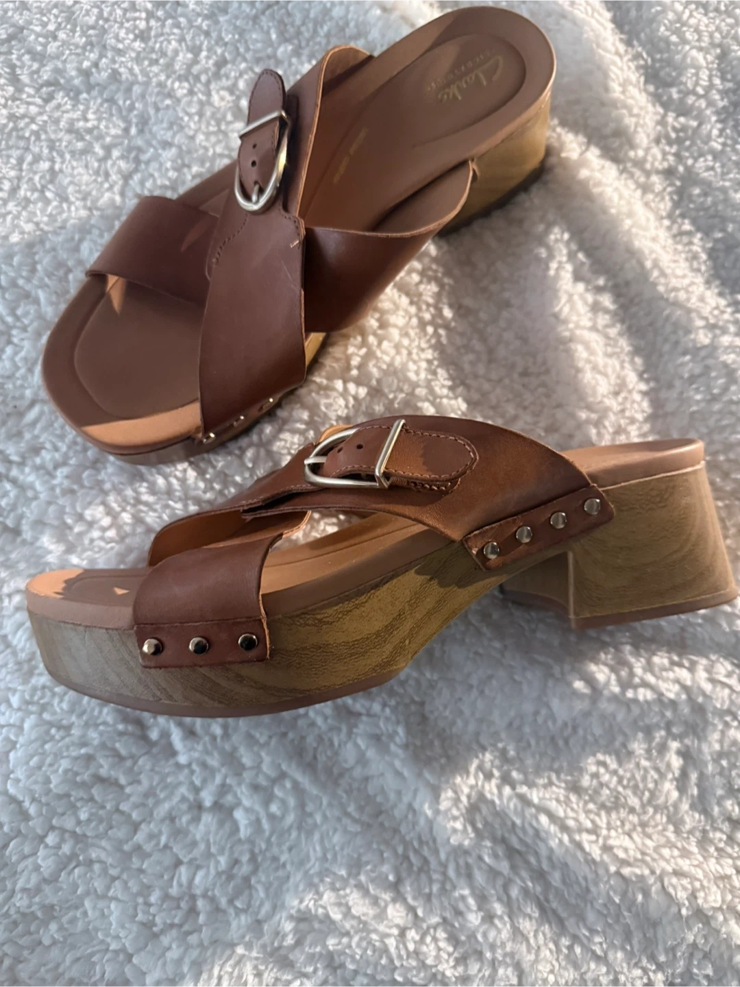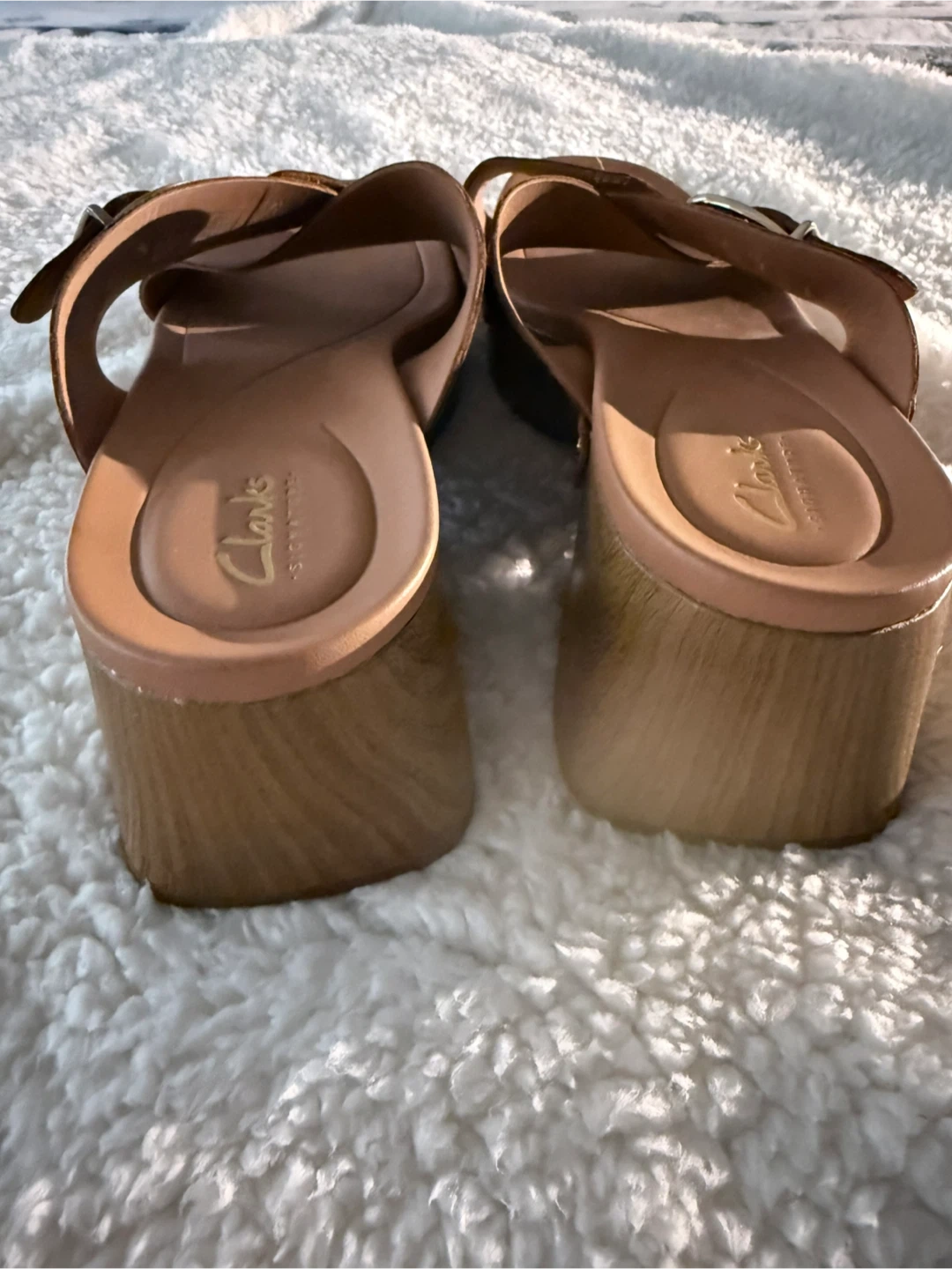 These are Clarks brand heeled sandals. They are a brown leather with a buckle and wood-look heel. They are in good condition and ready for a new home!