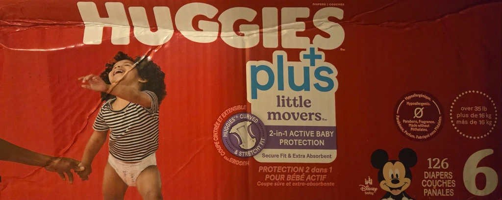 Selling a box of Huggies Plus Little Movers diapers, size 6. These are designed for active babies with a 2-in-1 active baby protection, offering secure fit and extra absorbency. They're also hypoallergenic, made without parabens, fragrance, and phthalates. Each diaper is designed to fit babies over 35 lb (16 kg). There are 126 diapers in the box