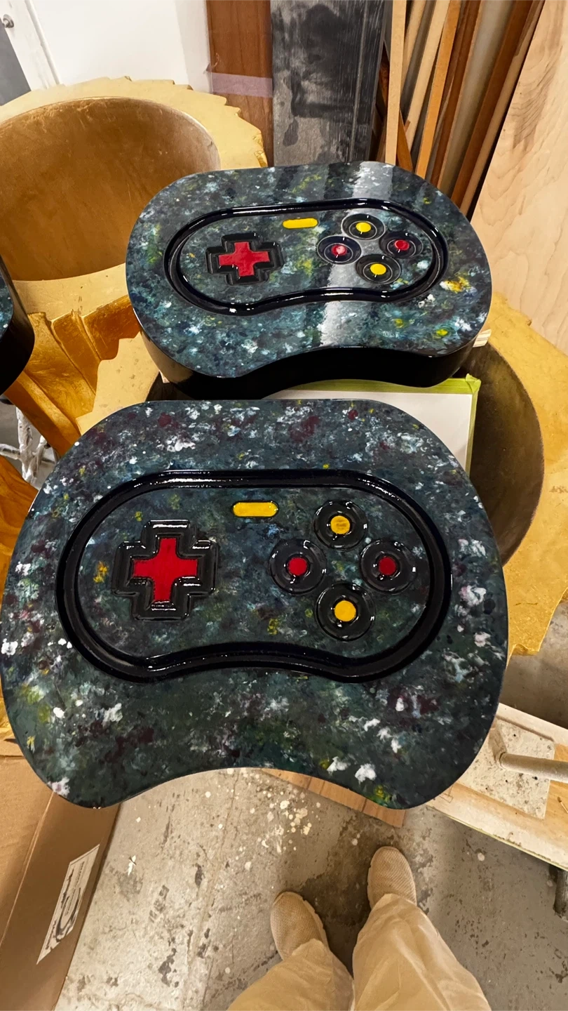 Unique set of three decorative game controller pieces. They're made from resin with a marbled green and multi-color finish. Each piece resembles a classic video game controller with buttons and a directional pad. WOOD