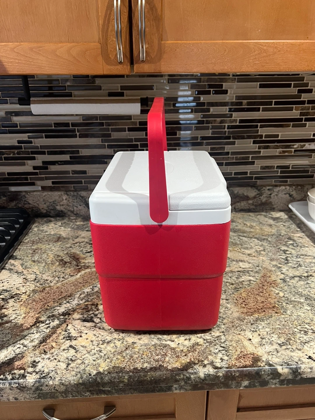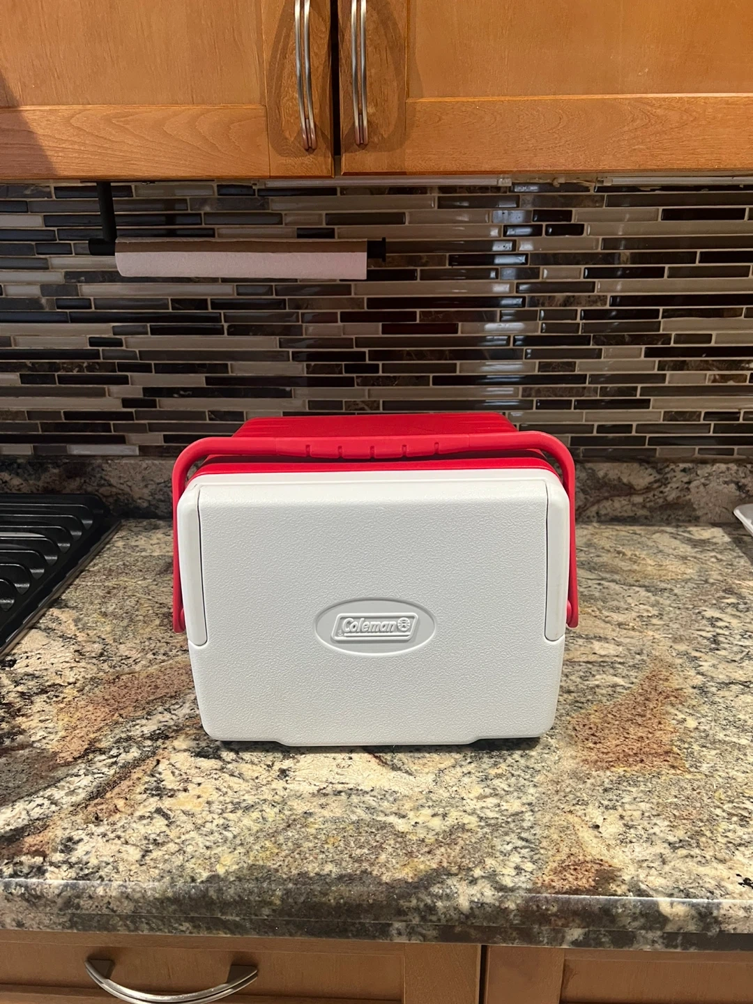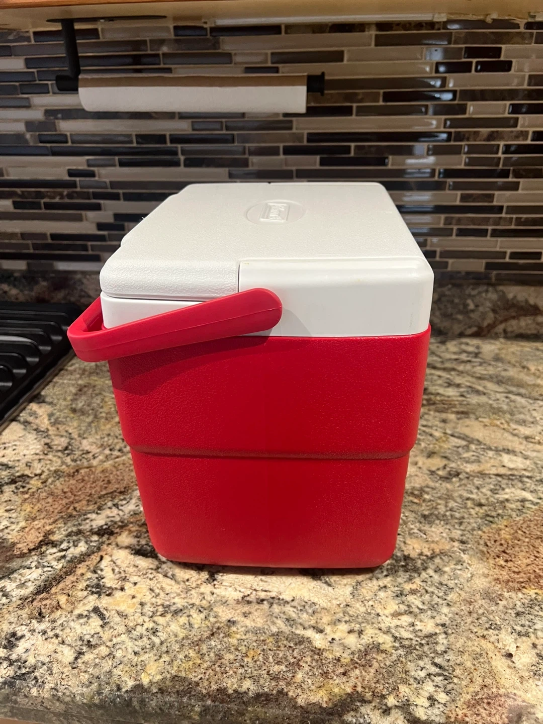 Coleman cooler in red and white. It's a handy size for picnics or day trips. Interior is divided for organization. Handle folds down for easy storage.