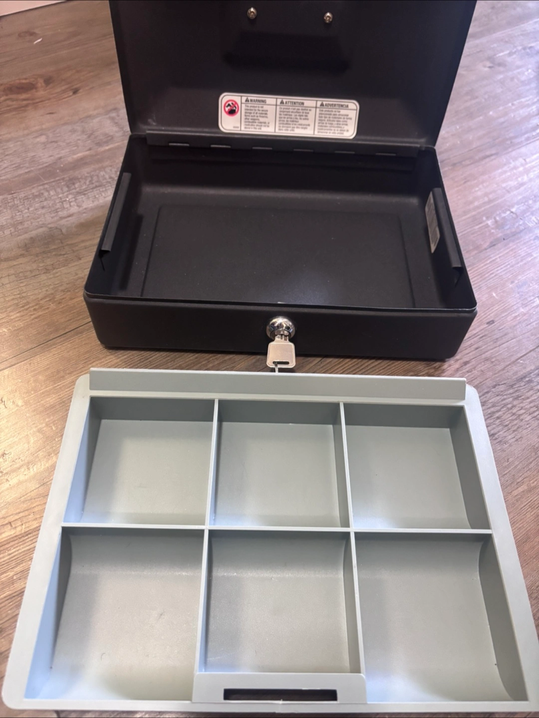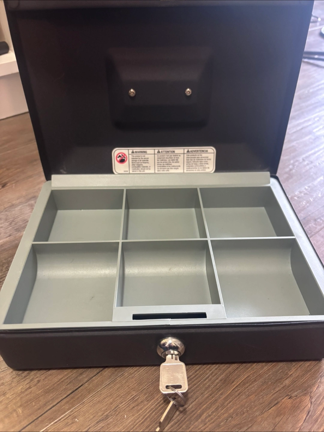 Small metal security cash box. Features a removable tray with six compartments. Includes key. Great for storing small valuables.