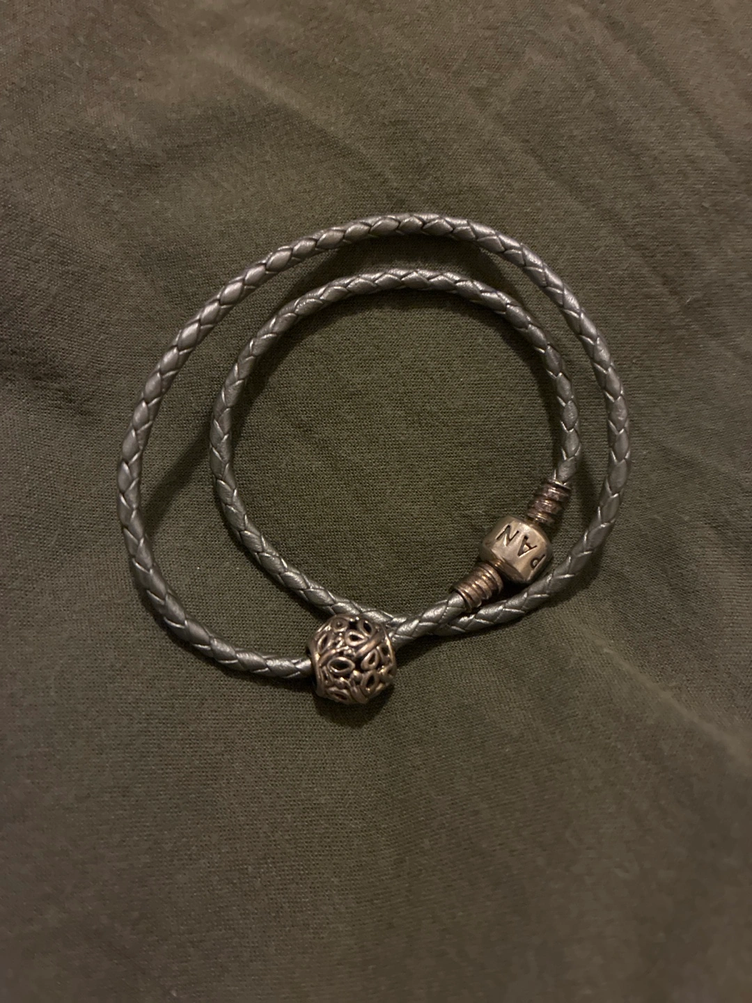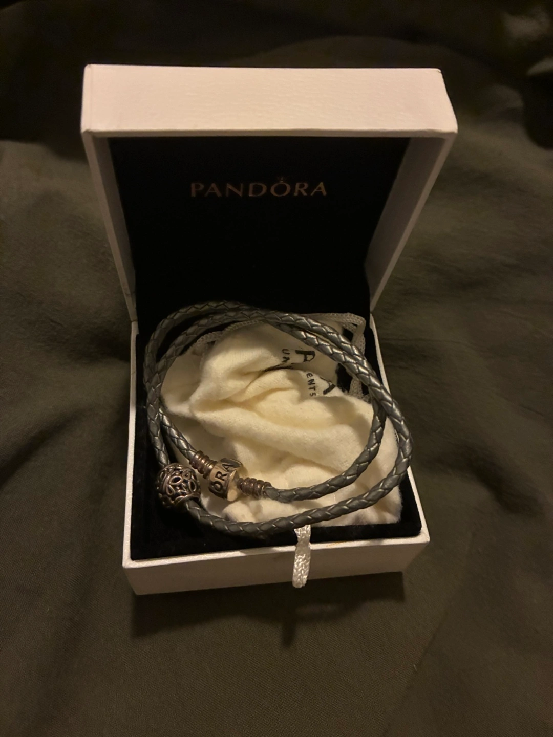 Silvery Pandora bracelet with charm, in original packaging. The bracelet is made to fit a more slender wrist, it’s never been worn.