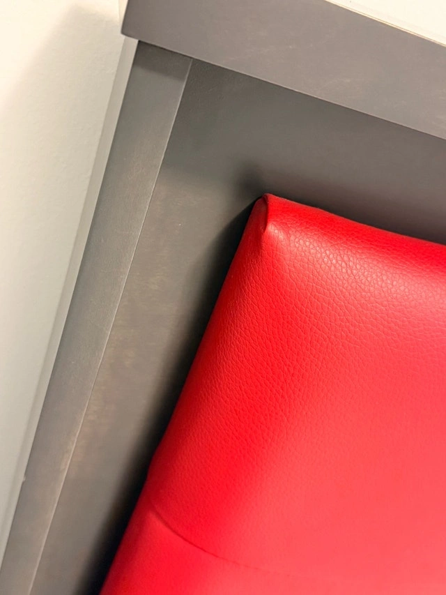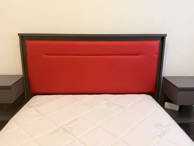 Grey Italian wood with red Italian leather customized double/full size bed. 82” x 62” x 44”