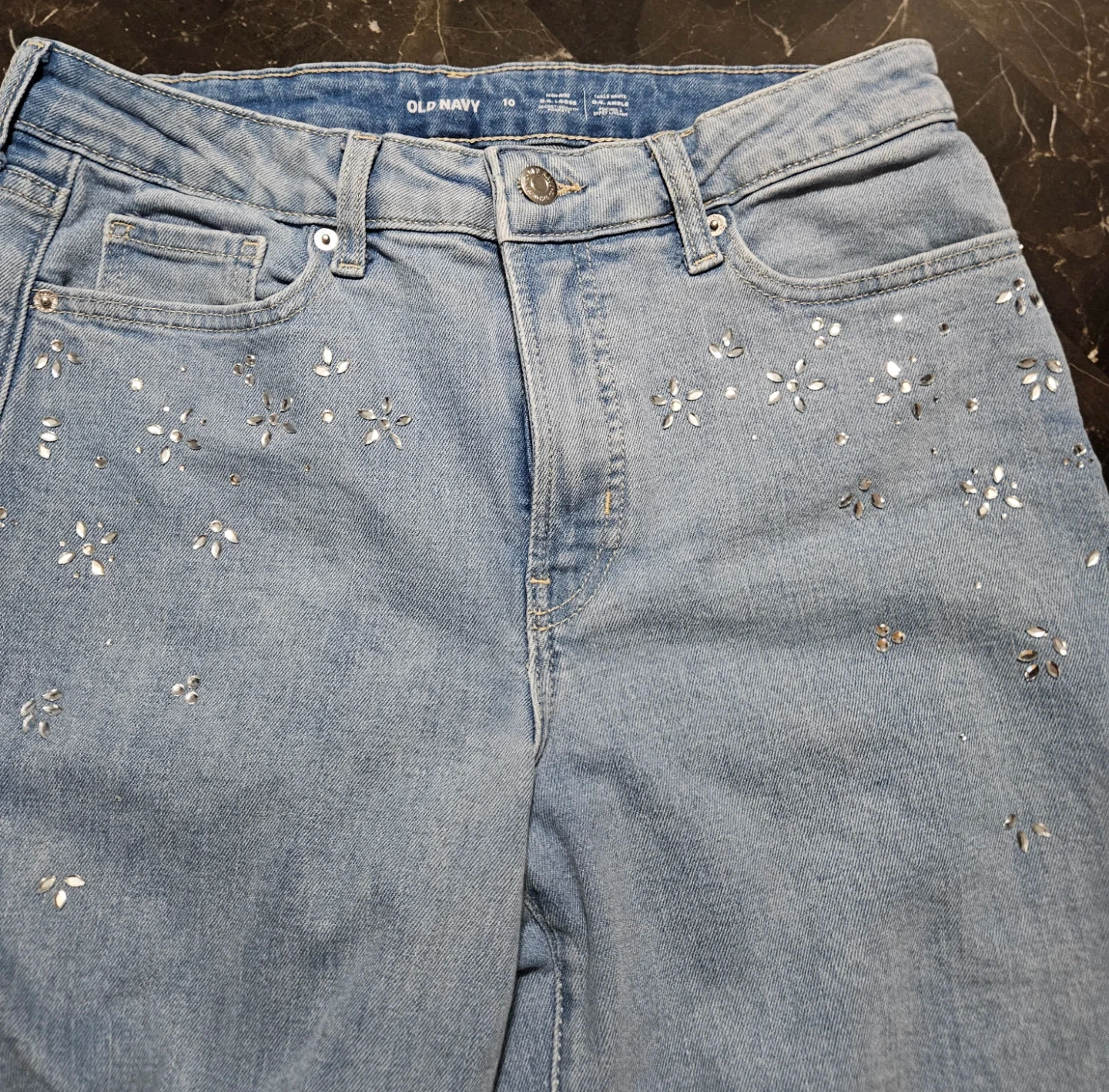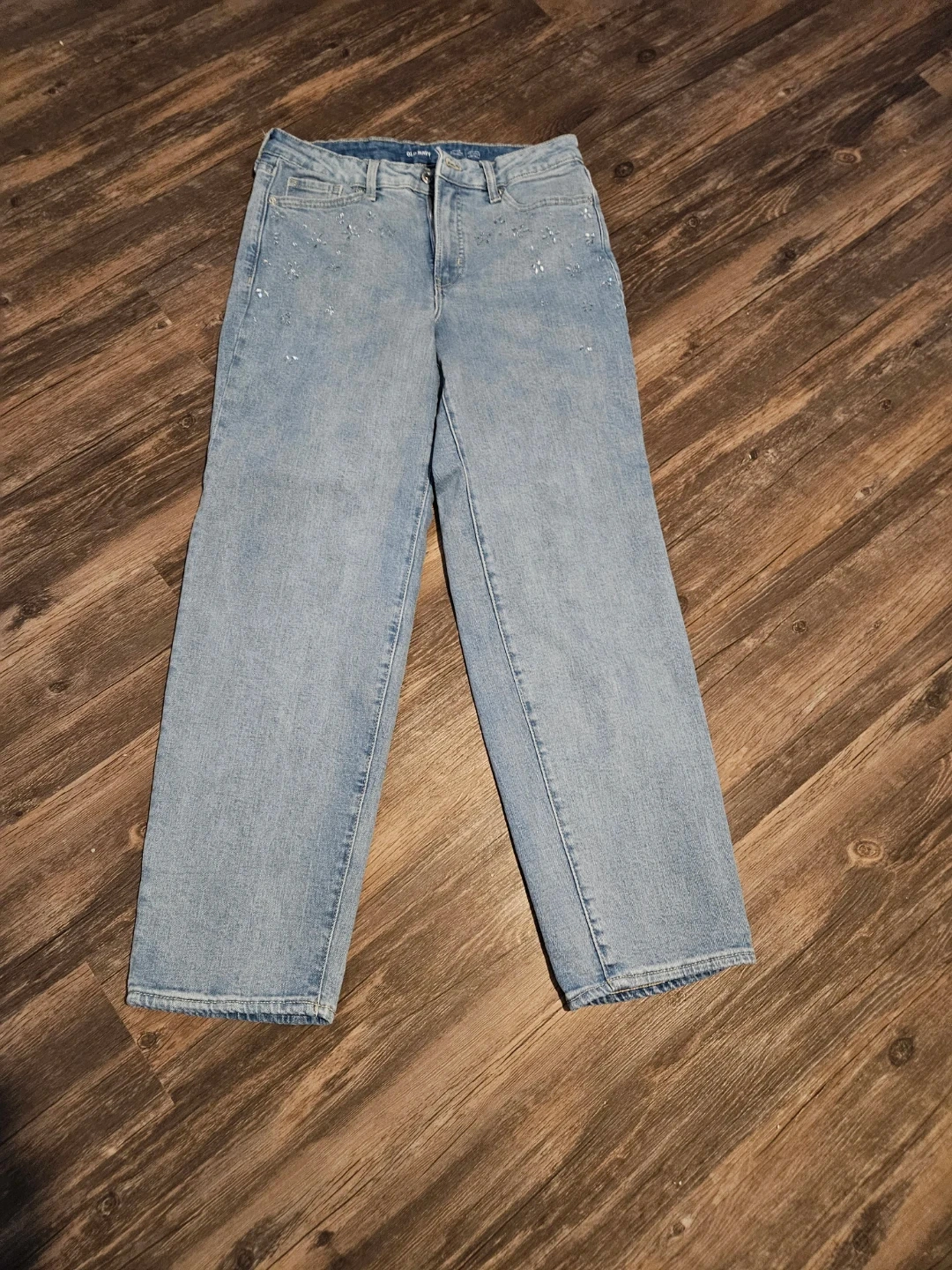 These are light wash Old Navy jeans with a high-waisted, wide-leg fit. They're embellished with scattered sparkly floral details on the front. Size 10. Pick up east mountain. Cash please. Non-smoking.