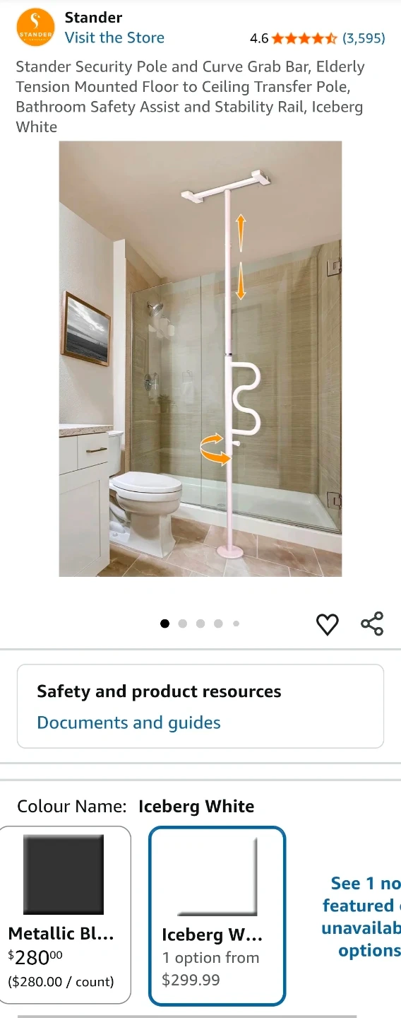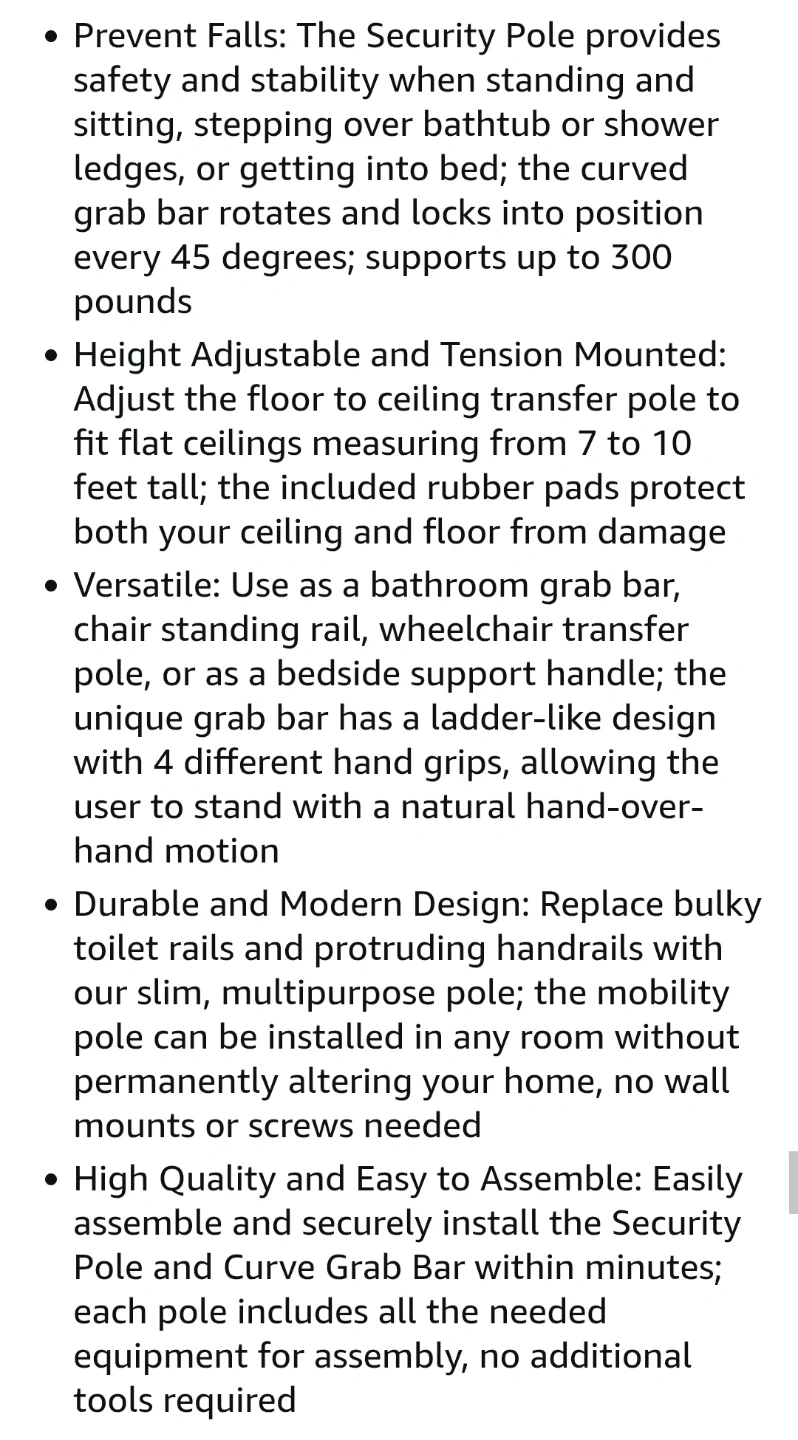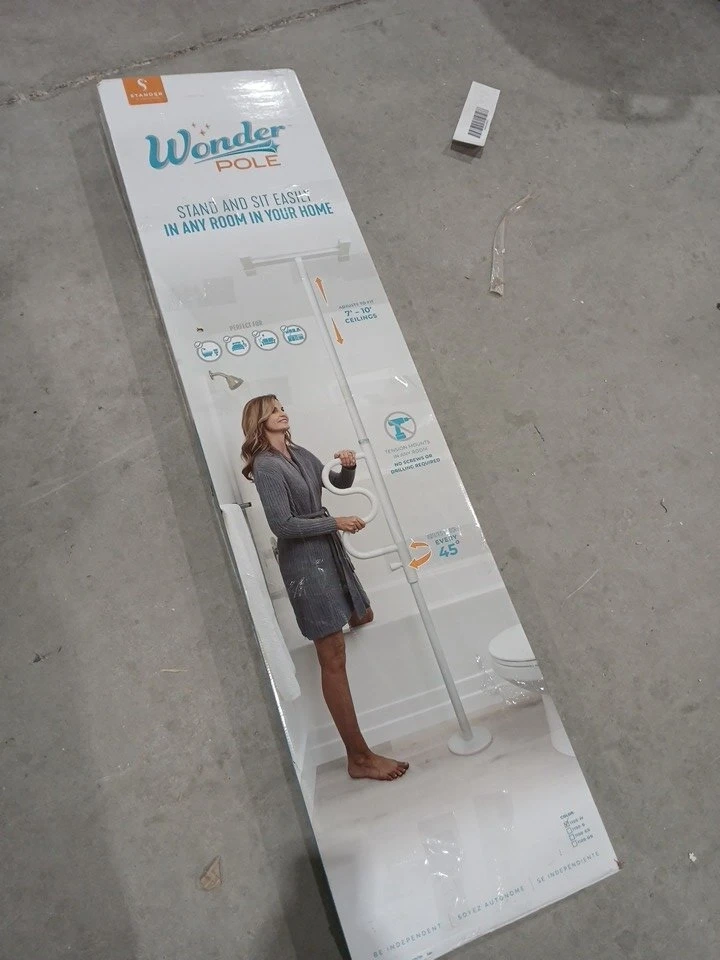 I'm offering a new Stander Wonder Pole, designed to help you stand and sit easier in any room of your home. This security pole and curve grab bar is tension mounted from floor to ceiling, fitting ceilings from 7 to 10 feet tall. It's an excellent bathroom safety assist and stability rail.