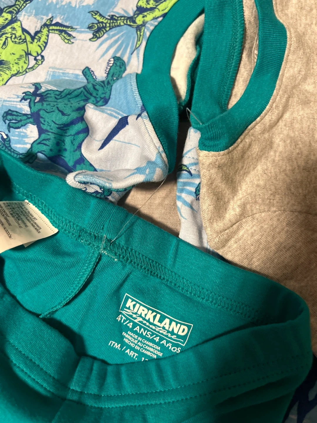 Selling a cute Kirkland brand pajama set for kids! The set features a fun dinosaur print and is size 4T. Perfect for your little one's bedtime routine. They are never washed or worn with the string on.