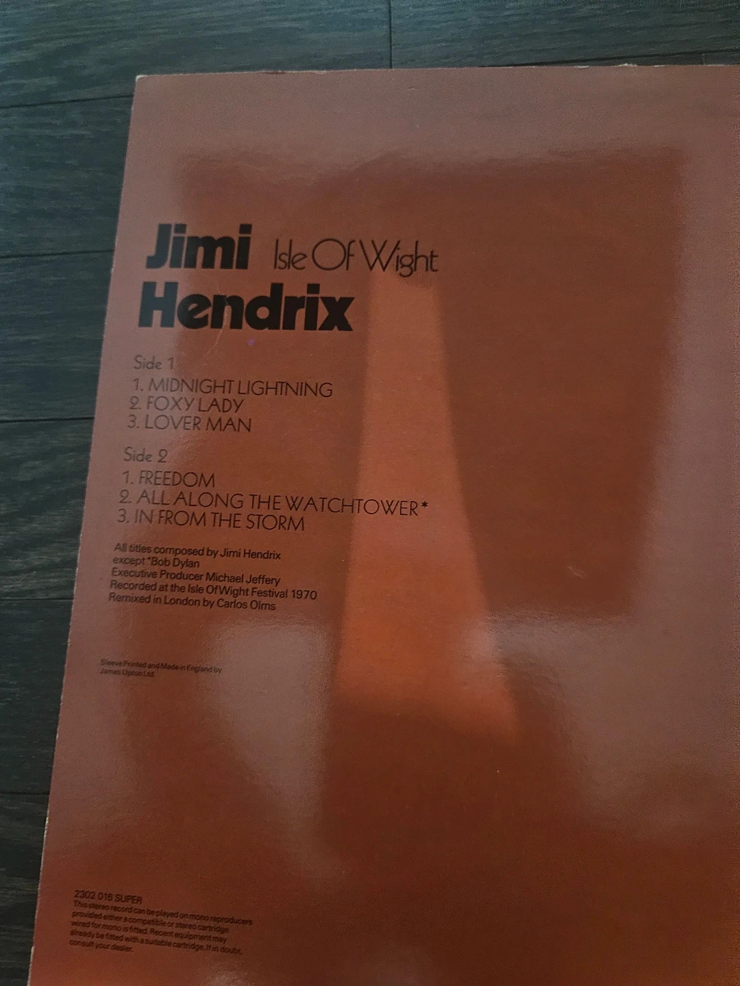 Jimi Hendrix Isle of Wight vinyl record. Includes songs like 'Midnight Lightning', 'Foxy Lady', 'Freedom', and 'All Along the Watchtower'. Recorded live at the Isle of Wight Festival 1970. Sleeve printed and made in England.