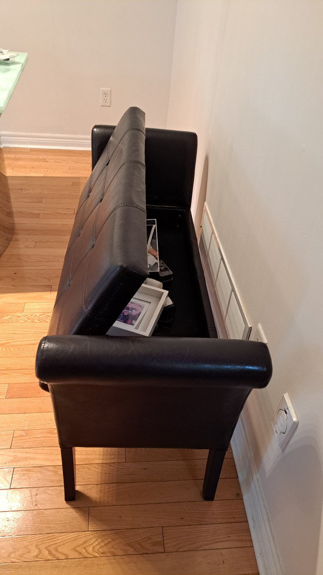 Black storage ottoman bench in great condition. It's perfect for adding extra seating and storage to any room. The top lifts up to reveal a spacious storage compartment, ideal for blankets, pillows, or other items. It's a stylish and functional piece of furniture that will complement any decor