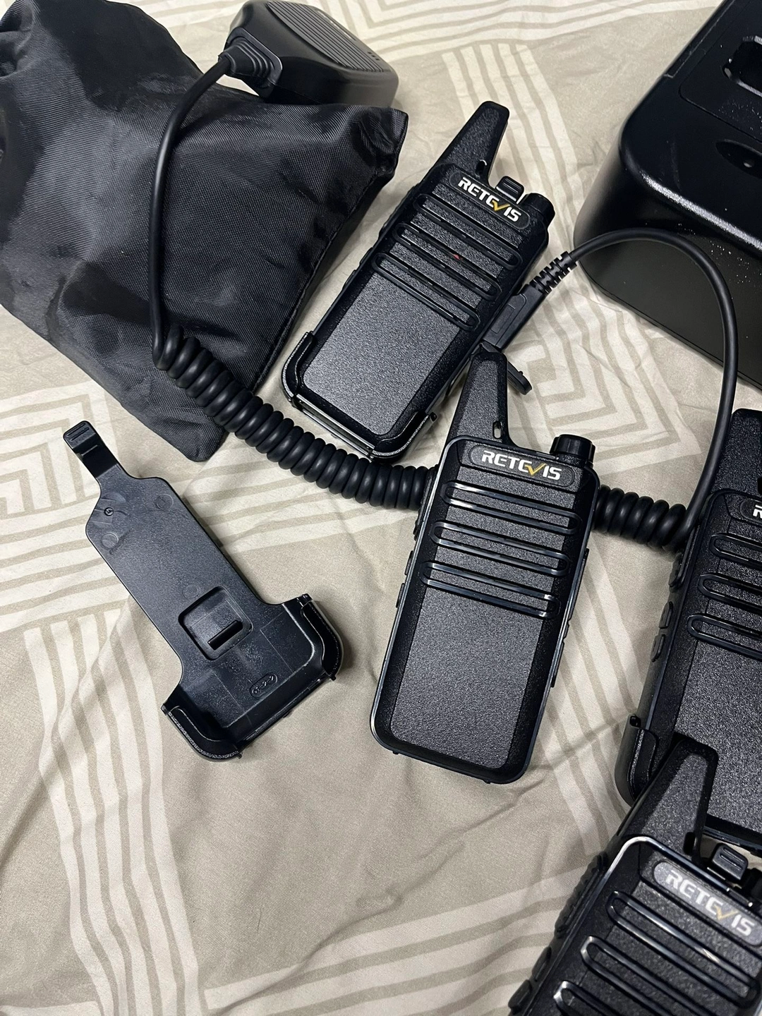 Six two-way radios with charger port and portable chargers. Open box with manual. One includes a microphone adapter. Model: RT22.