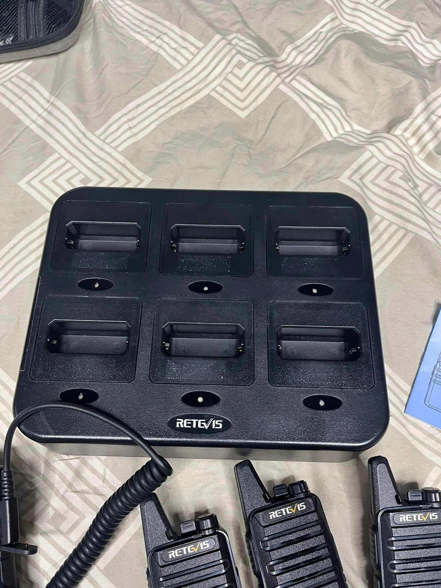 Six two-way radios with charger port and portable chargers. Open box with manual. One includes a microphone adapter. Model: RT22.