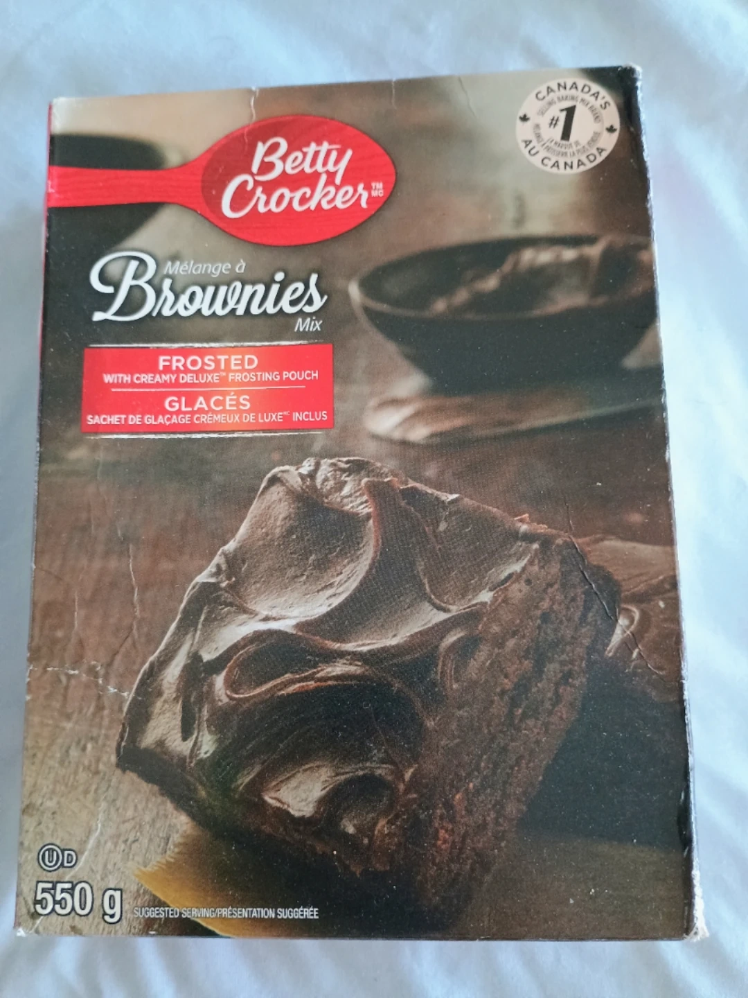 Betty Crocker Frosted Brownies Mix includes a creamy deluxe frosting pouch. The box contains 550g of mix. This brownie mix is ready to bake!