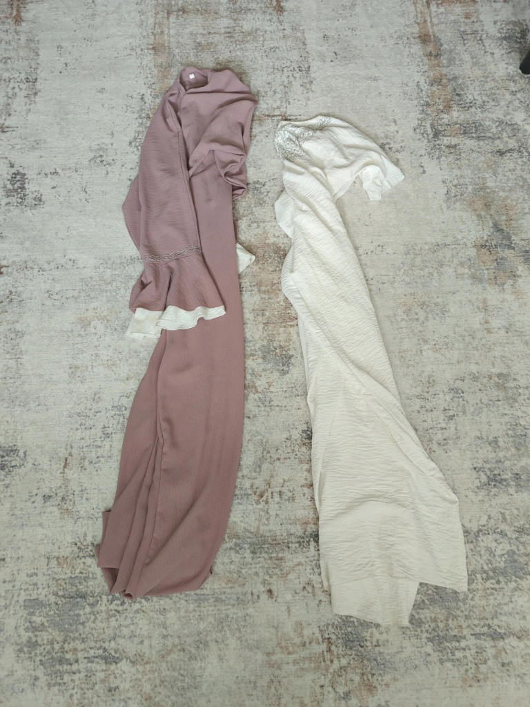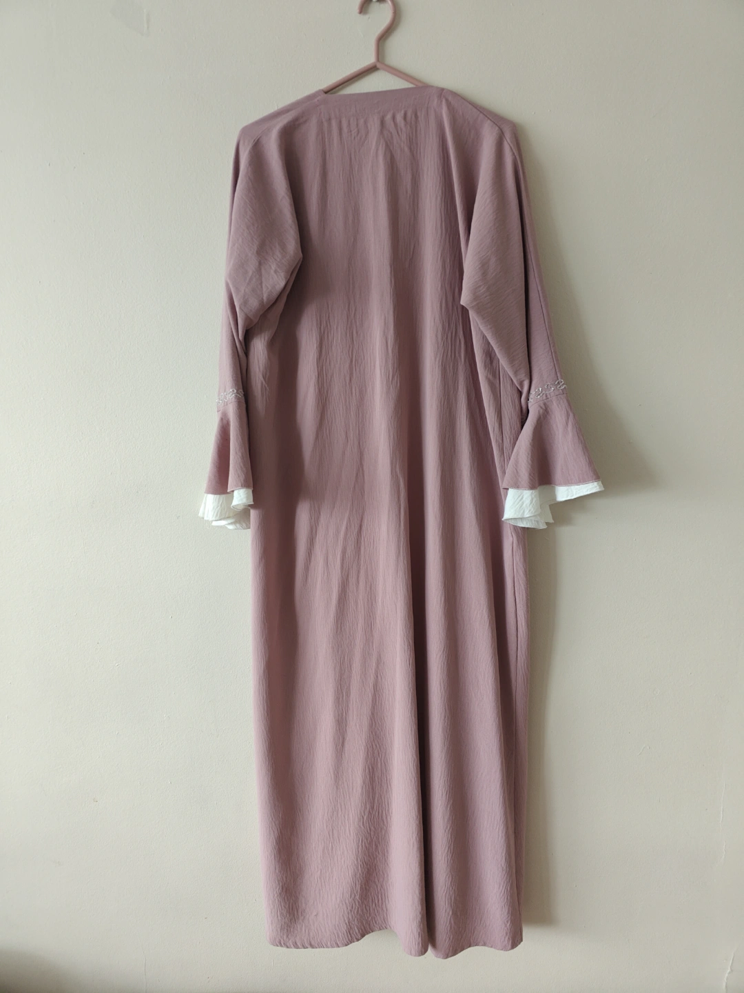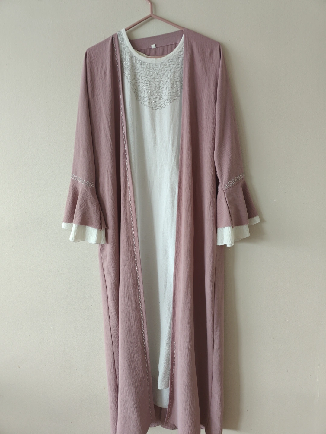 Abaya in dusty rose colour. Long sleeves with flared cuffs, adorned with white trim. White top with embellished neckline. It would be perfect for a relaxing day at home.