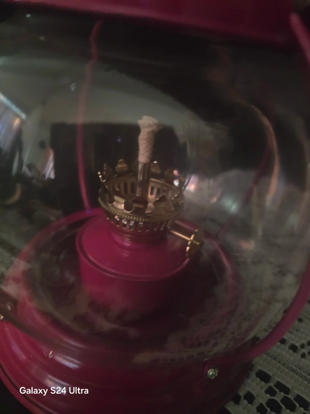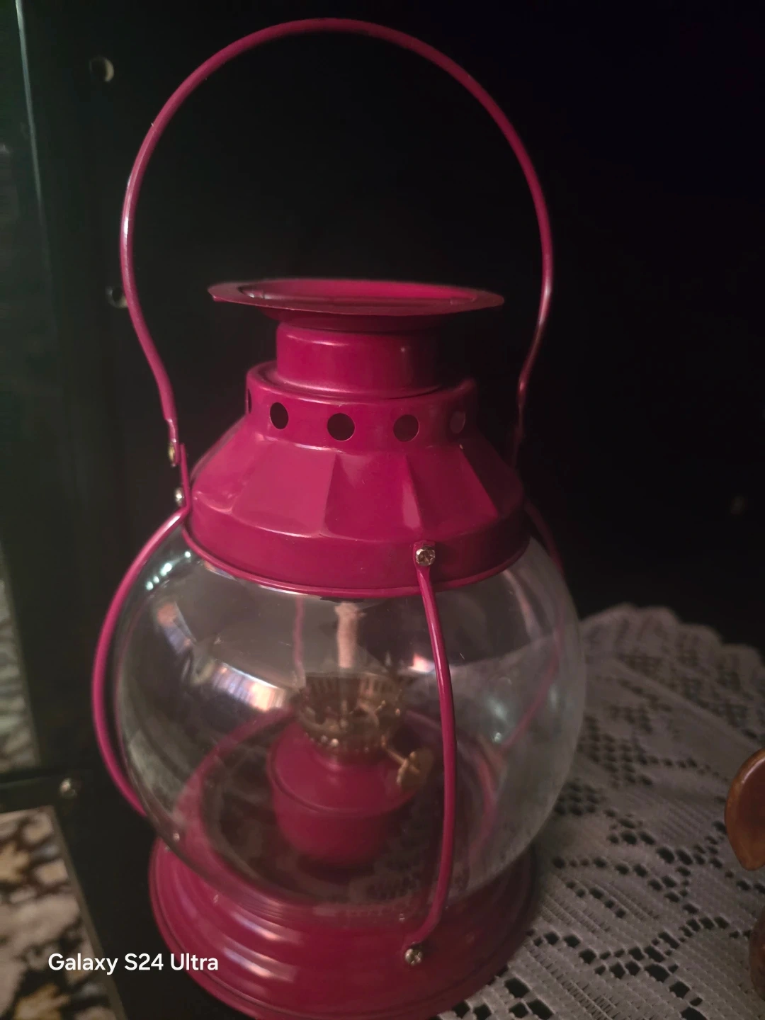 A cute pink decorative lantern with a clear glass globe. It's in great condition and would add a nice touch to any room